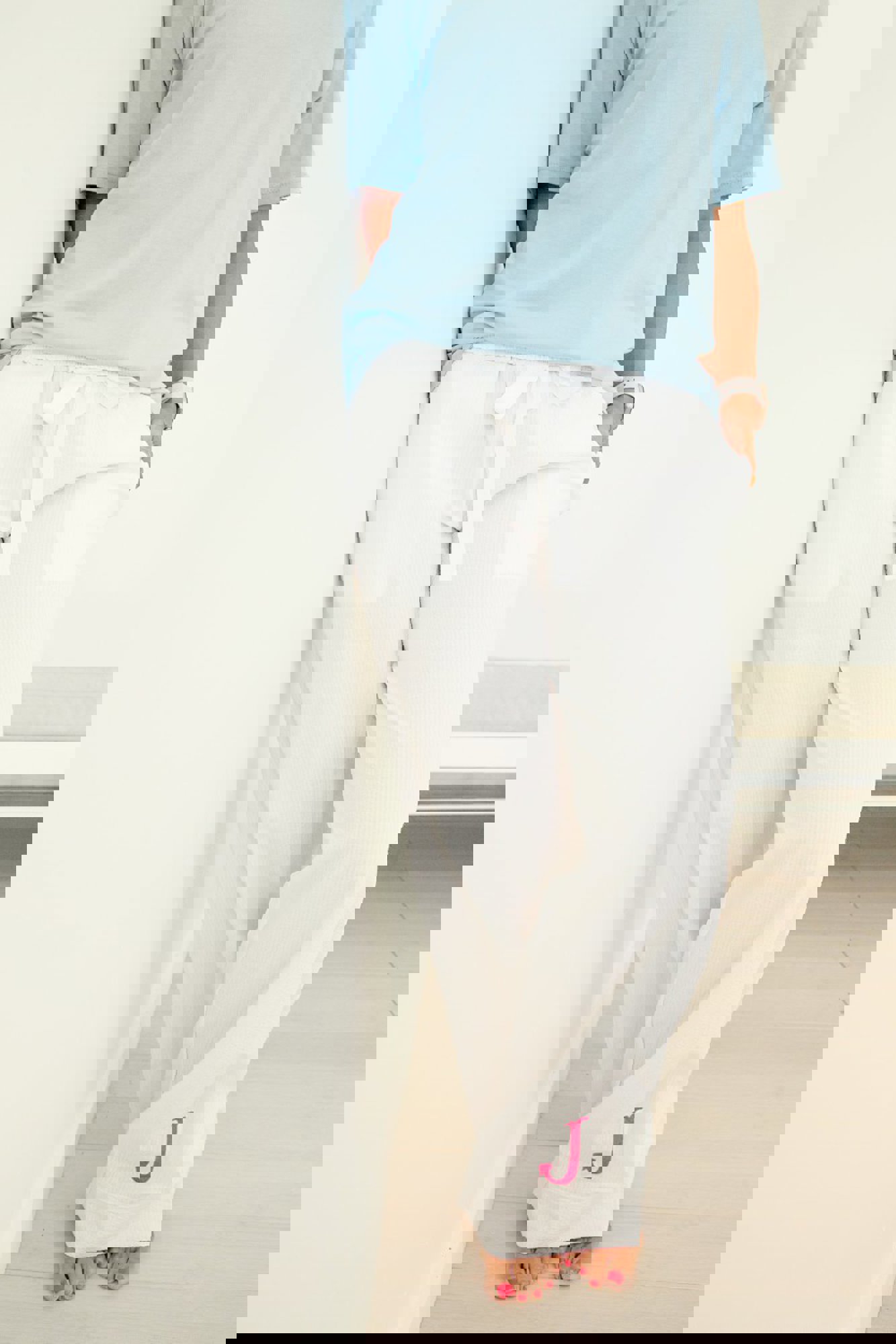 These are a standard women's pajama fit; NOT junior fit. Elastic waist with white drawstring twill tape tie, 3.5" inseam; standard true to size. The seersucker fabric is crafted over elastic on the inside to allow seersucker to show if folded over; perfect for monogram!