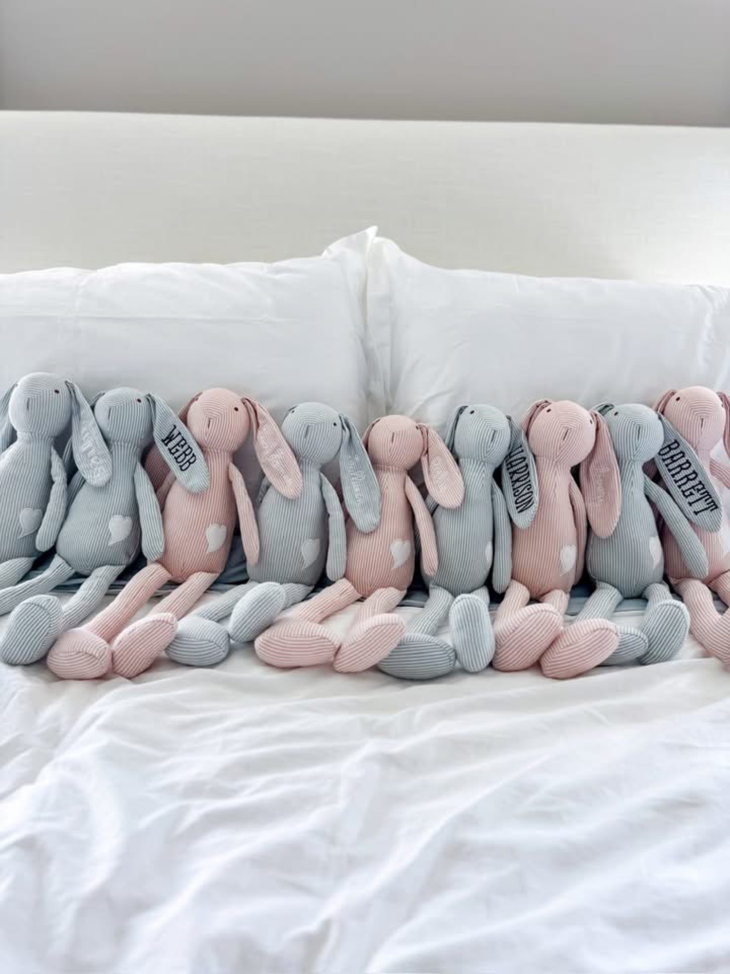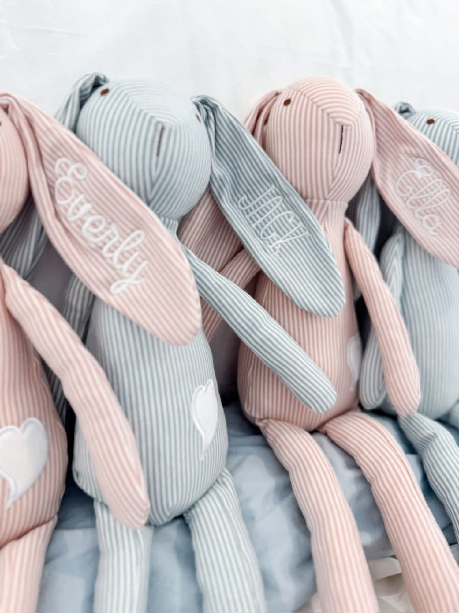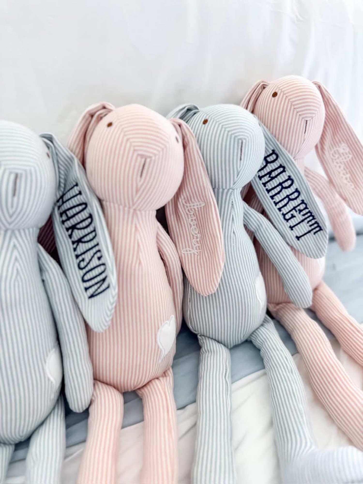 Meet the sweetest Easter companion! This adorable 16-inch striped bunny plush is the perfect personalized gift for Easter baskets, baby gifts, and keepsake treasures. Designed with soft pastel stripes, floppy ears, and a cuddly feel, this charming bunny is both a lovable toy and a meaningful personalized memento.