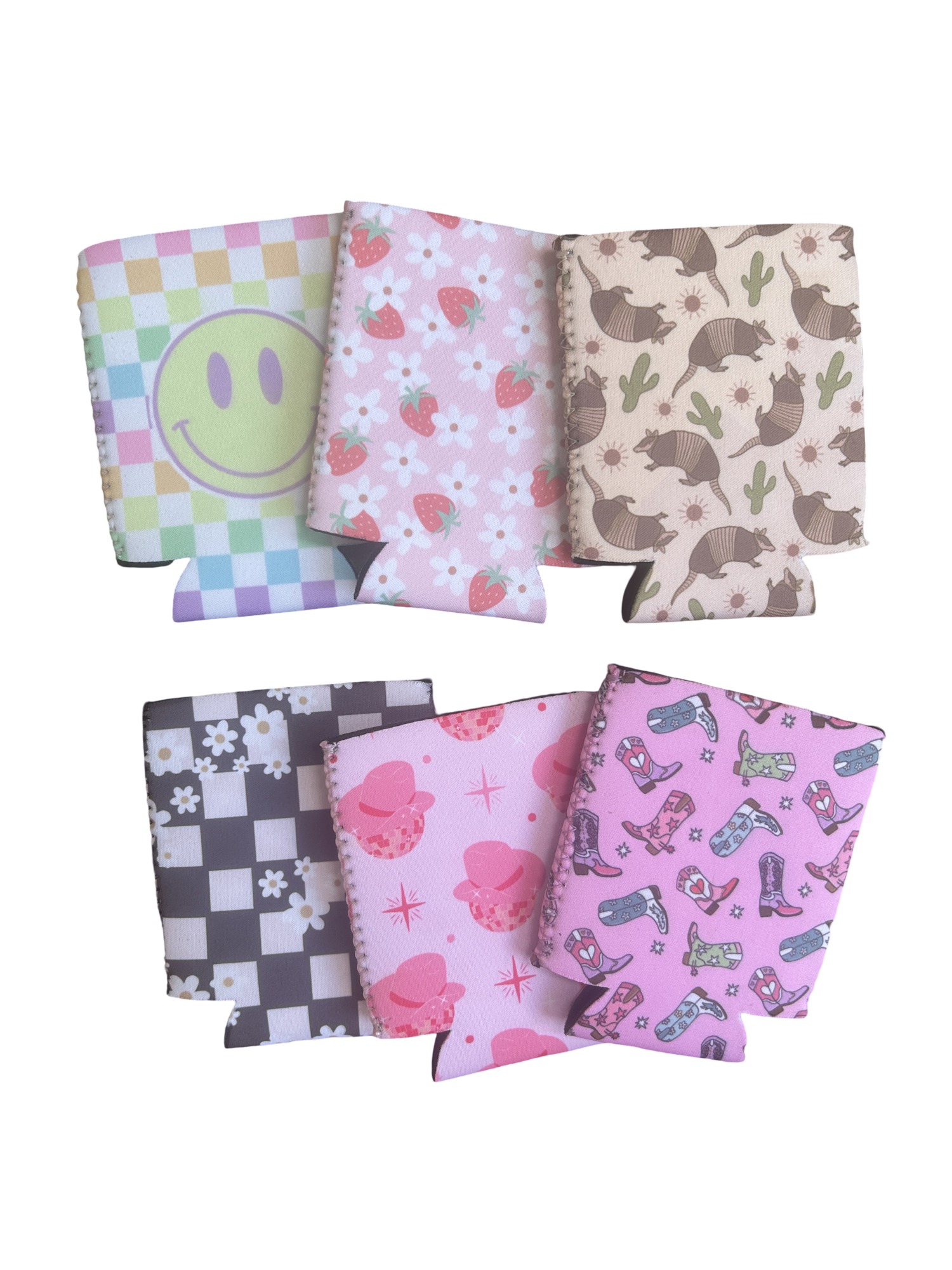 100% neoprene can coolers measure 5x4 inches and include a hang card.  Design on both front and back. Sized for regular 12fl oz cans.