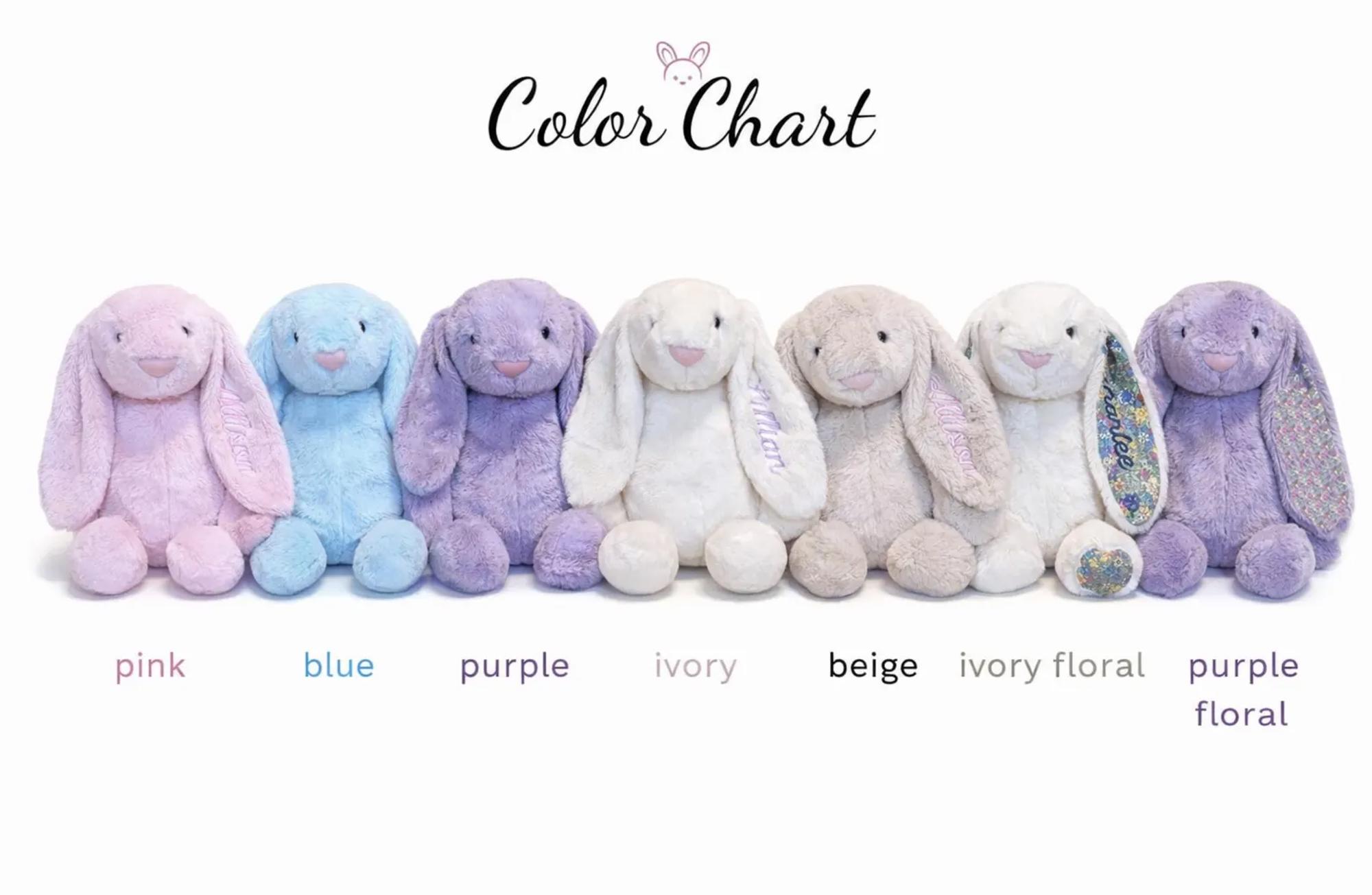 We use high-quality embroidery thread that's durable and beautiful. The personalization is stitched directly onto the bunny - not a patch or vinyl - so it becomes a permanent, cherished part of your bunny friend! The back of the ear will have visible stitching, which is subtle and barely noticeable.
