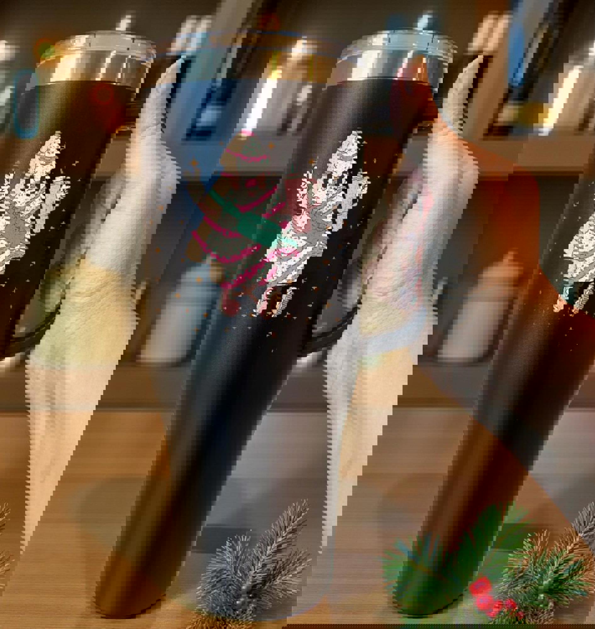 Cute Christmas Tree Girl Tumbler with Handle, Holiday Coffee Tumbler for Women, Christmas Travel Mug, Coquette Pink Tree Cup, Winter Gift Idea, 40 oz Style Mug