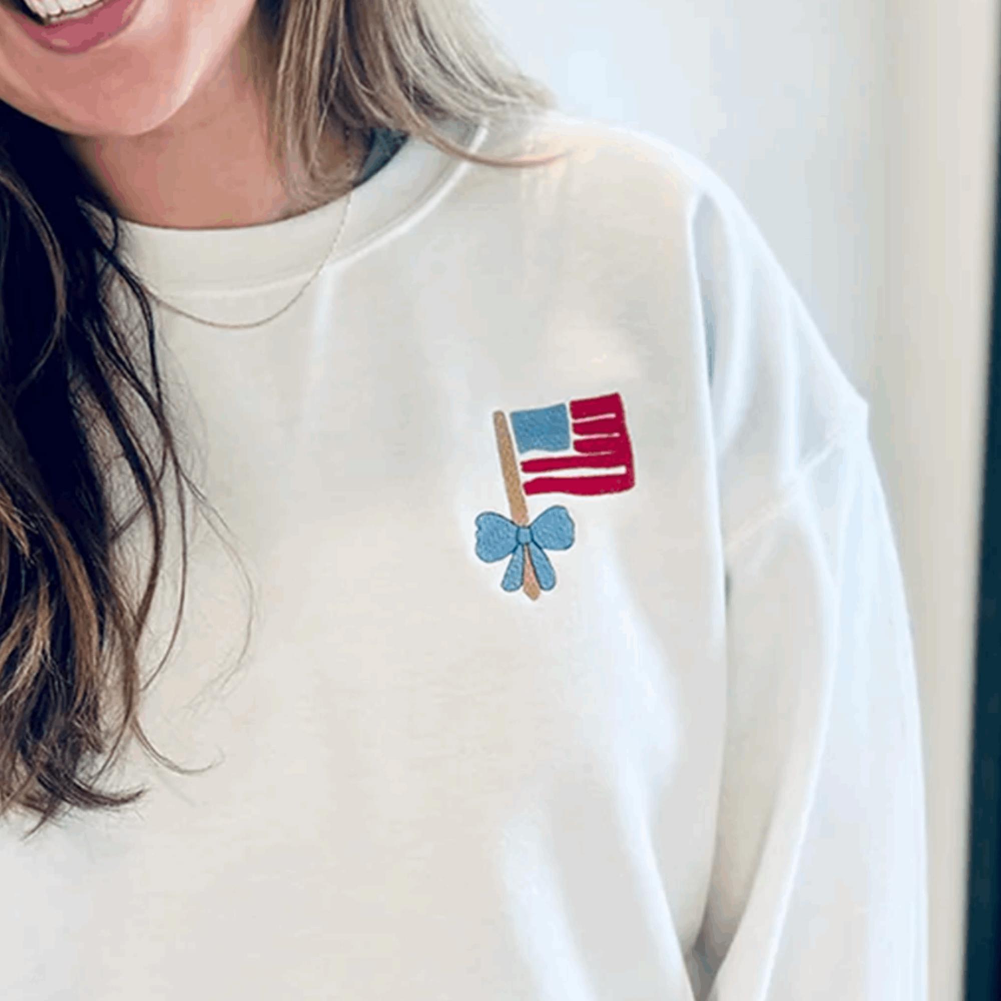 Embroidered Mini Flag & Bow 4th of July Sweatshirt – Cute Patriotic Crewneck for Women, USA Flag Embroidery, Independence Day Outfit