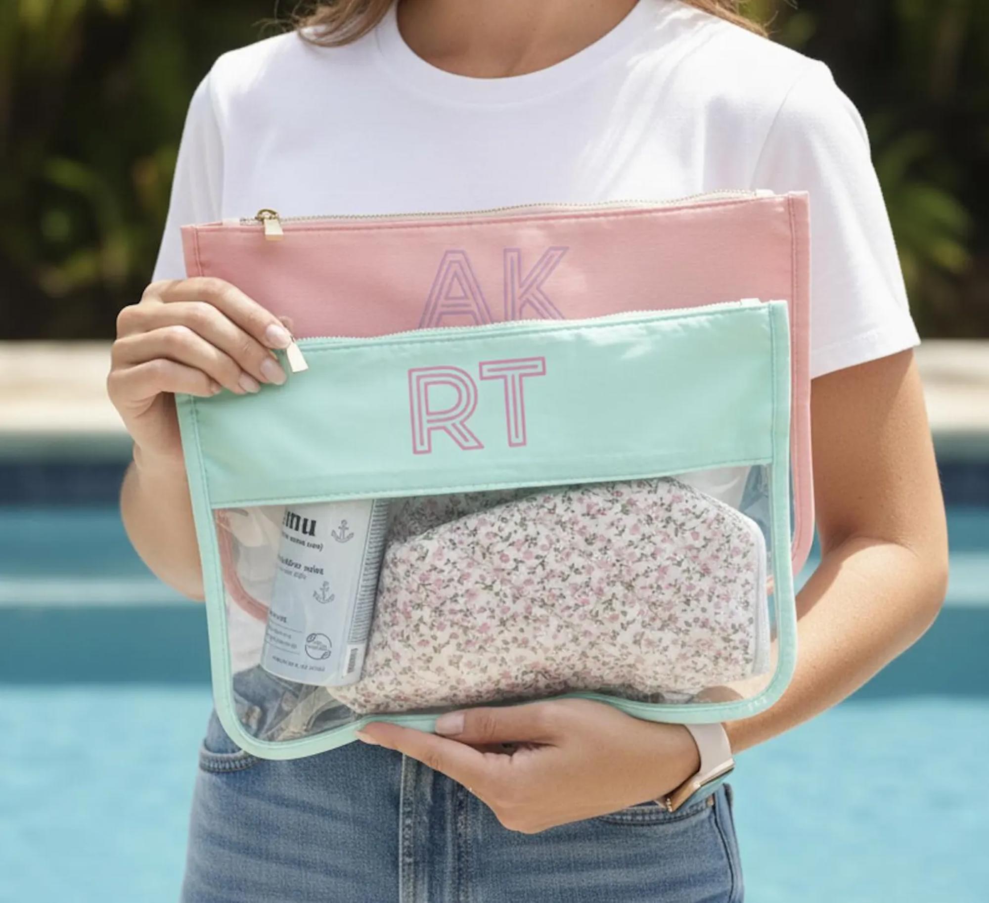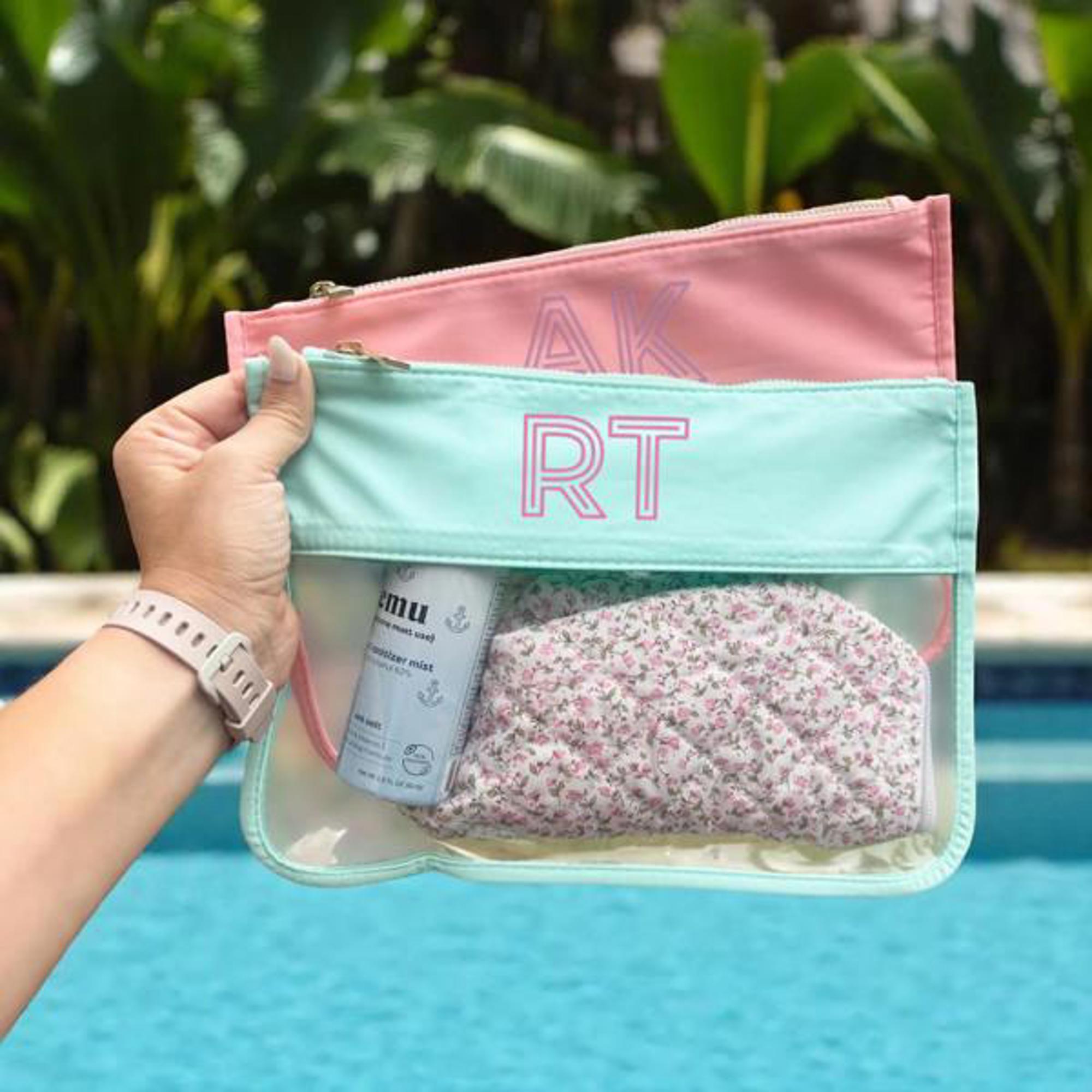 Embroidered Shadow Monogram Pool Bag Custom Toiletry Bag, Nylon Clear Pouch, Bachelorette Party Beach Zipper Bag for Sunscreen Bikini Snack