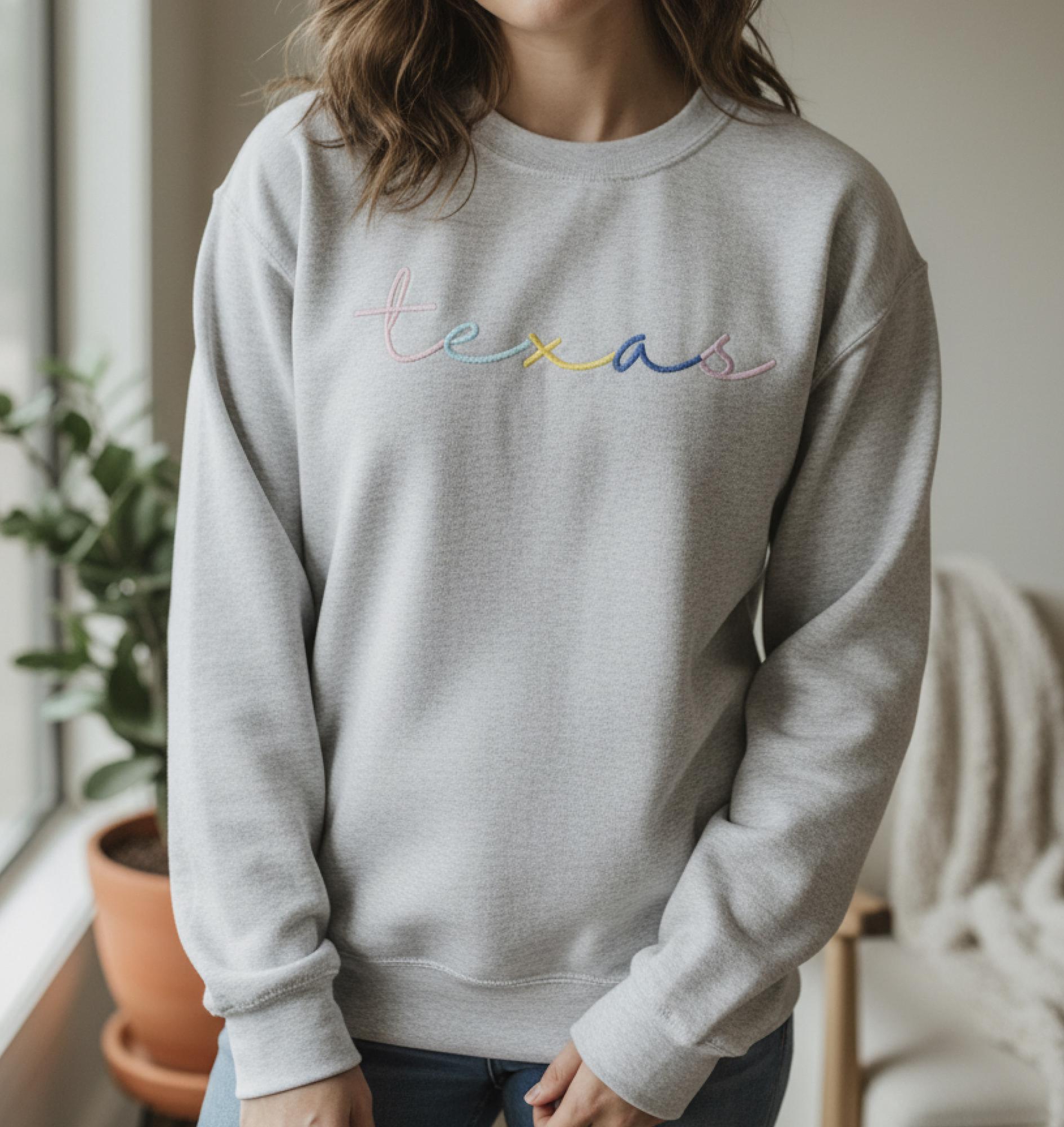 Show off your state pride with this beautifully personalized sweatshirt featuring custom embroidered script in gorgeous rainbow colors. Perfect for celebrating your home state, favorite vacation spot, team name, city, or where your heart belongs. Each letter is carefully embroidered in a different vibrant color, creating a unique and eye-catching design that is as special as your connection to your place.