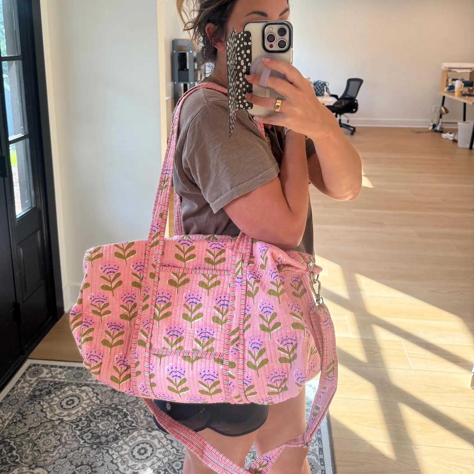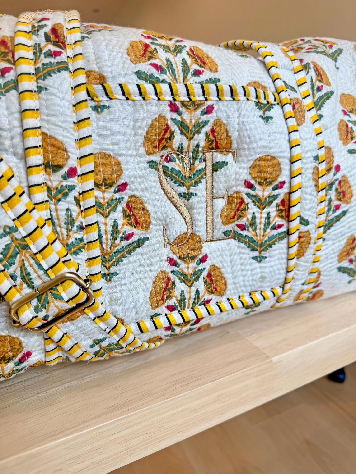 Our Large Embroidered Quilted Tote Bag is the perfect blend of style and functionality. Featuring an option to monogram with a floral print, this duffle bag is ideal for bridesmaid gifts or bridal party bags. With a convenient zipper, it makes a lovely overnight bag and a thoughtful gift for her.