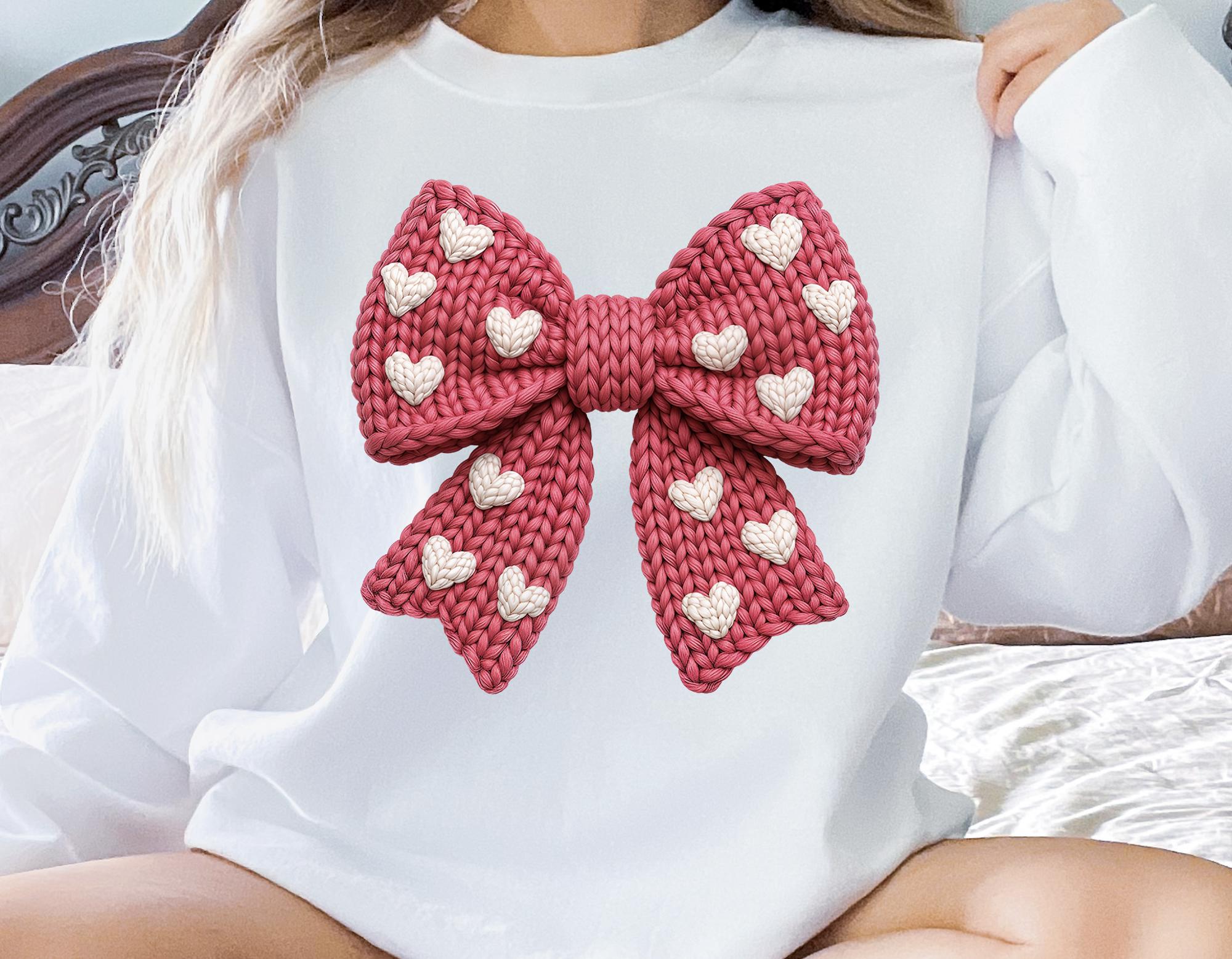 Knit Bow Heart Sweatshirt, Valentine's Day Graphic Crewneck, Pink Bow with Hearts, Sweatshirt Cute Valentine Gift