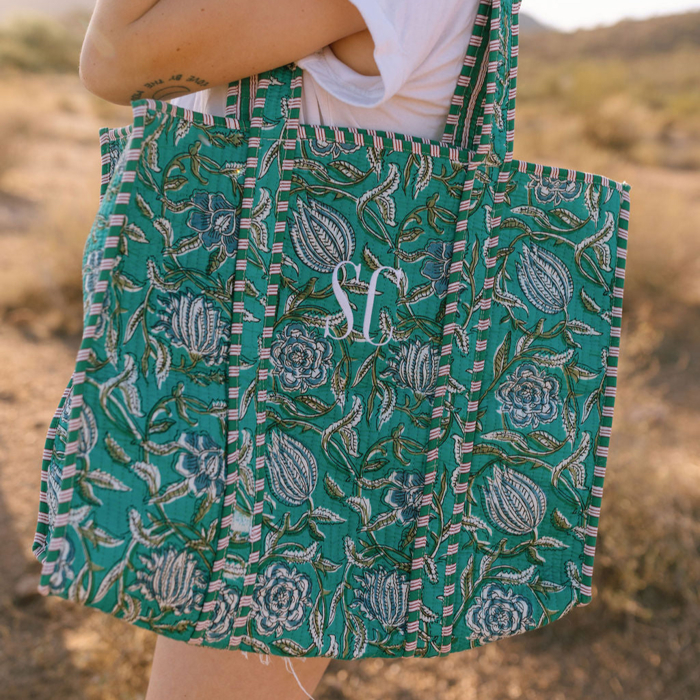 Carry style and function with our Embroidered Cotton Quilted Bag, featuring a beautiful block print design and intricate stitching. This lightweight yet spacious tote is perfect for everyday use, travel, or as a thoughtful bridesmaid gift. Handmade with care, it’s the perfect blend of boho charm and practicality, making it your go-to bag for any occasion! - Details - - This listing is for 1 cotton floral quilted tote bag - Large Size: 18"x18"x5.5" Handle 11" - Floral quilted exterior, interior stripes with pocket