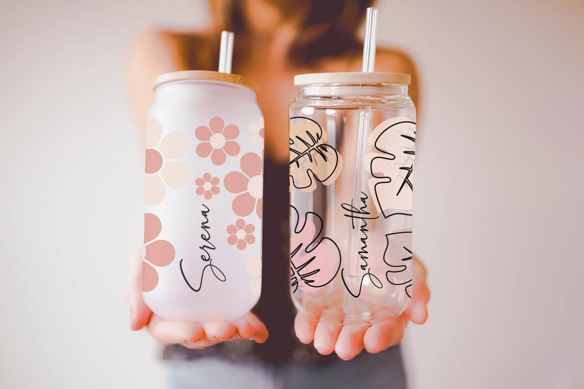 These clear or frosted glass tumblers / glass cans are personalized with the name of your choice. Featuring a bamboo lid to accommodate straw usage as well as easy sipping. An inner seal ring completes the secure, push on lid to minimize accidental leakage. Paired with a reusable durable straw with a ring stopper. These make the perfect gift for a friend or yourself!