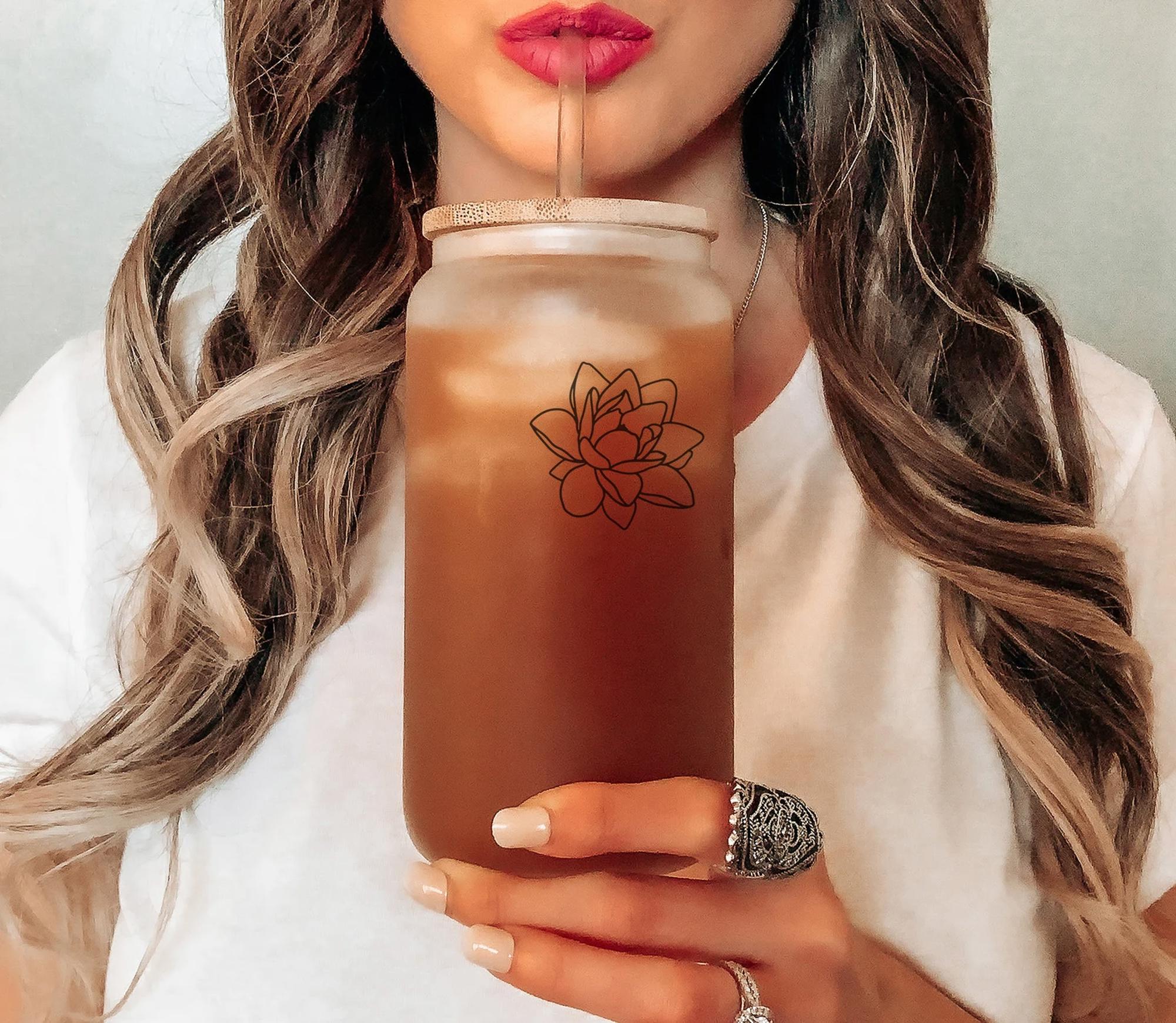 Personalized Iced Coffee Cup Floral Shell, Custom Can Glass with Lid and Straw, Bridesmaid Gift, Bachelorette Glass Cup, Bridesmaid Proposal