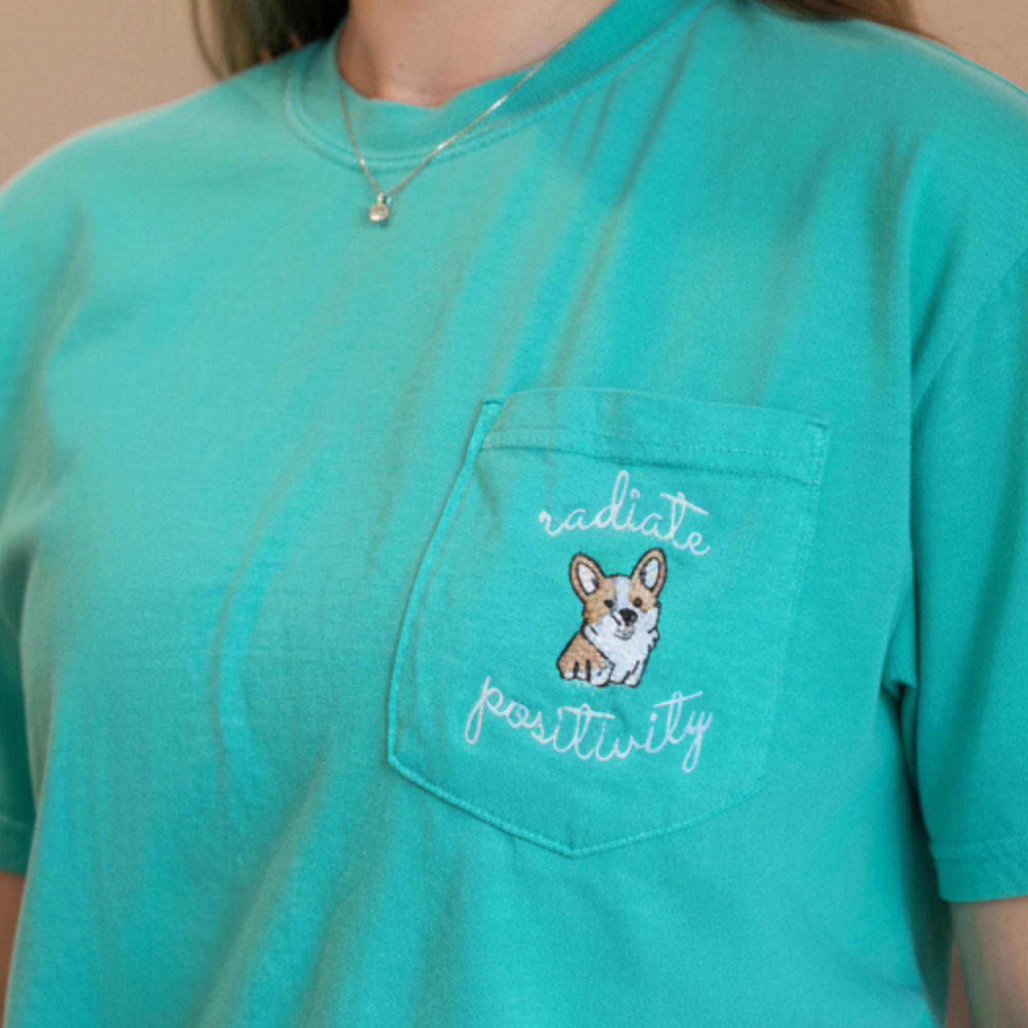 Radiate Positivity Embroidered Shirt, Corgi Pocket Tee, Cute Dog Lover Gift, Embroidered Graphic Tee, Positive Quote Shirt, Aesthetic Pet Lover Tee