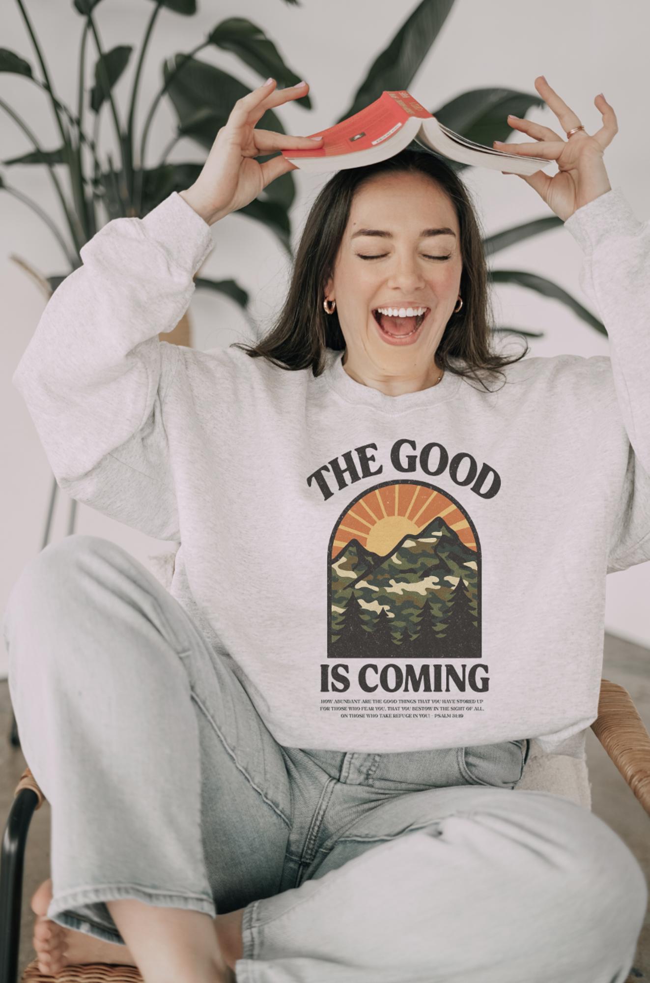 Find hope and encouragement with this beautiful "The Good Is Coming" Christian sweatshirt. Featuring a stunning vintage-inspired mountain landscape with a rising sun and the powerful message from Psalm 31:19, this cozy crewneck is a reminder that God has abundant good things stored up for those who trust in Him. Perfect for women who need encouragement during challenging seasons or simply want to wear their faith with style.