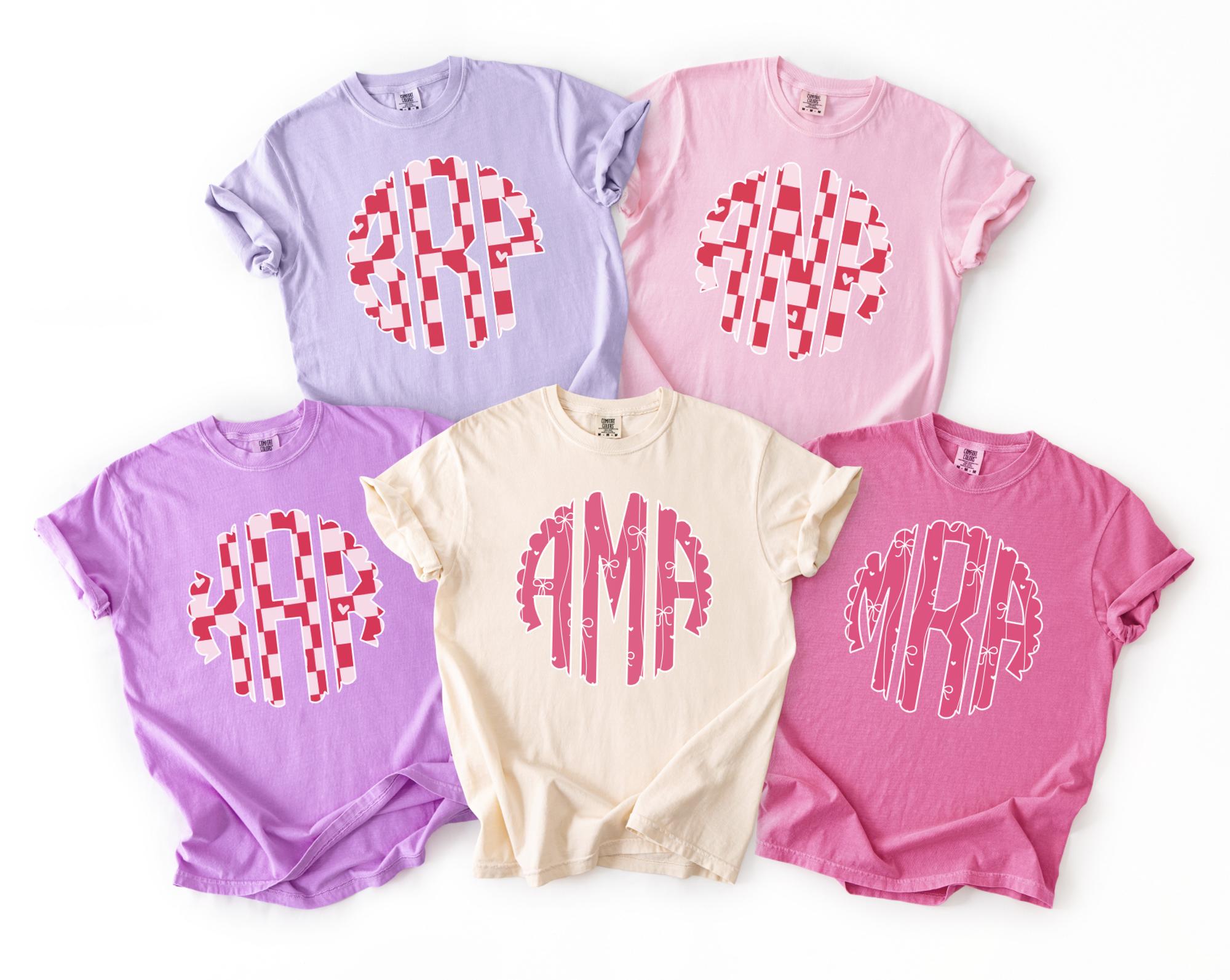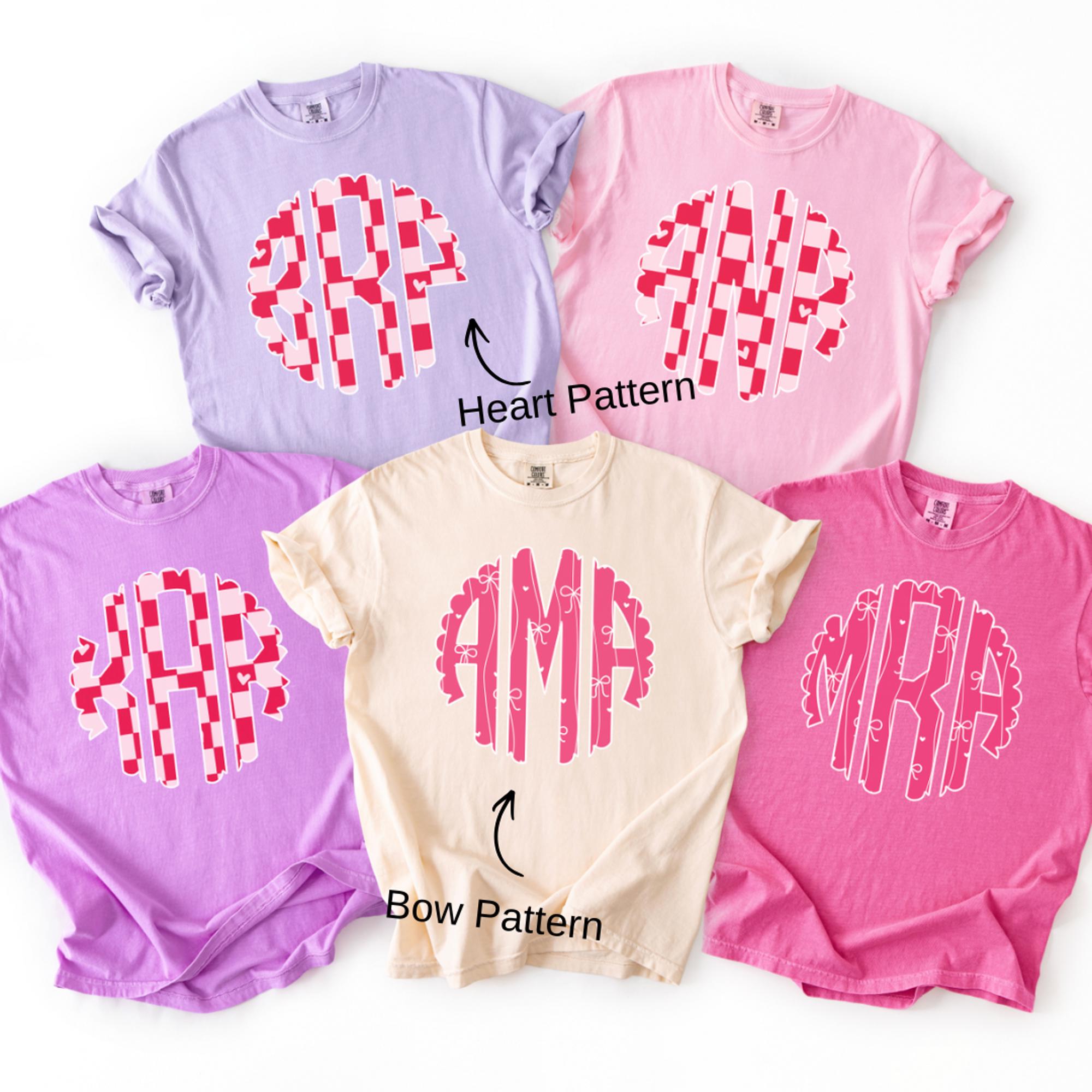 Custom Monogram Comfort Colors T-Shirt, Personalized Initial Tee, Heart or Bow Pattern, Gift for Her, Spring Pastel Colors