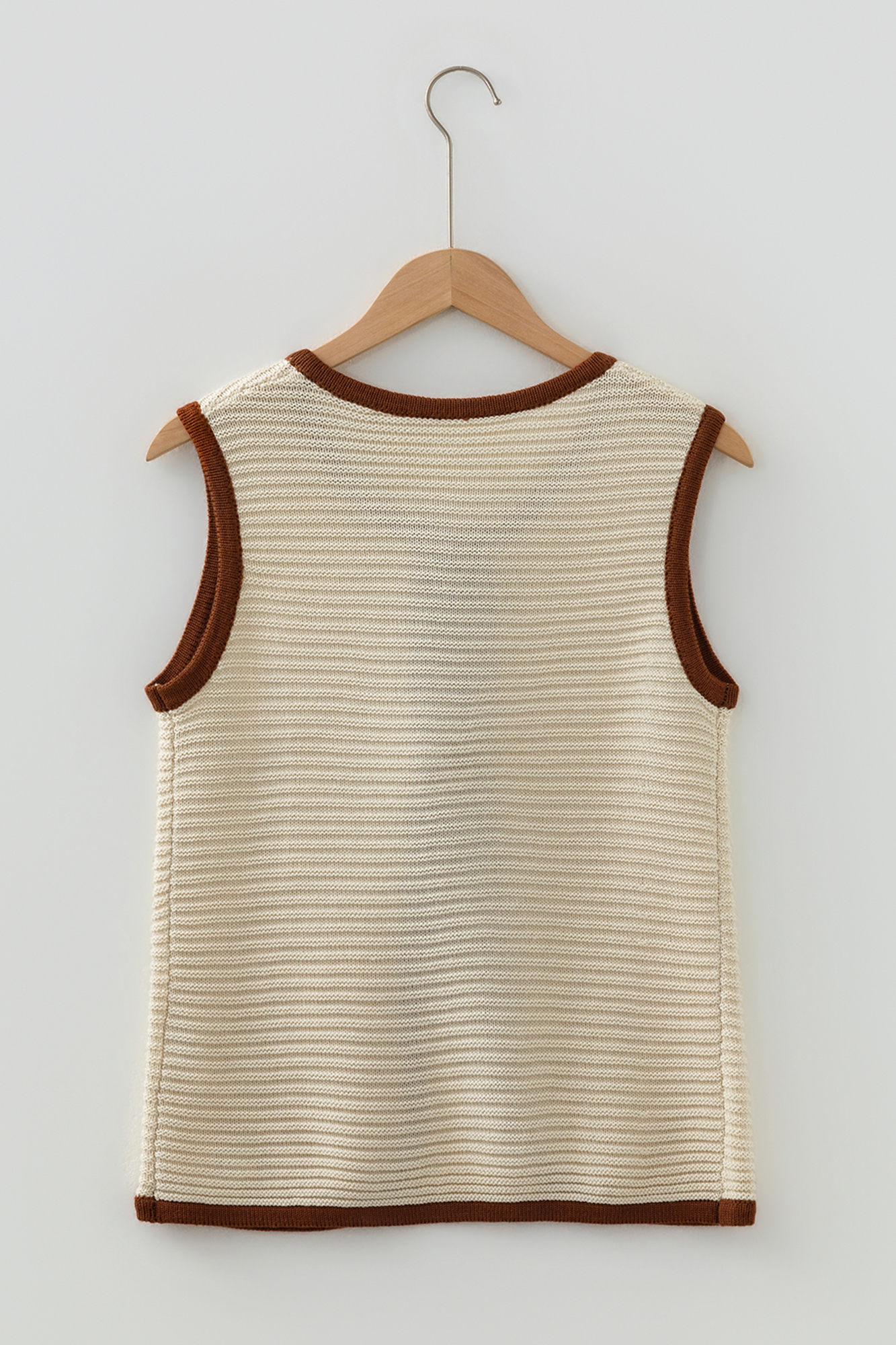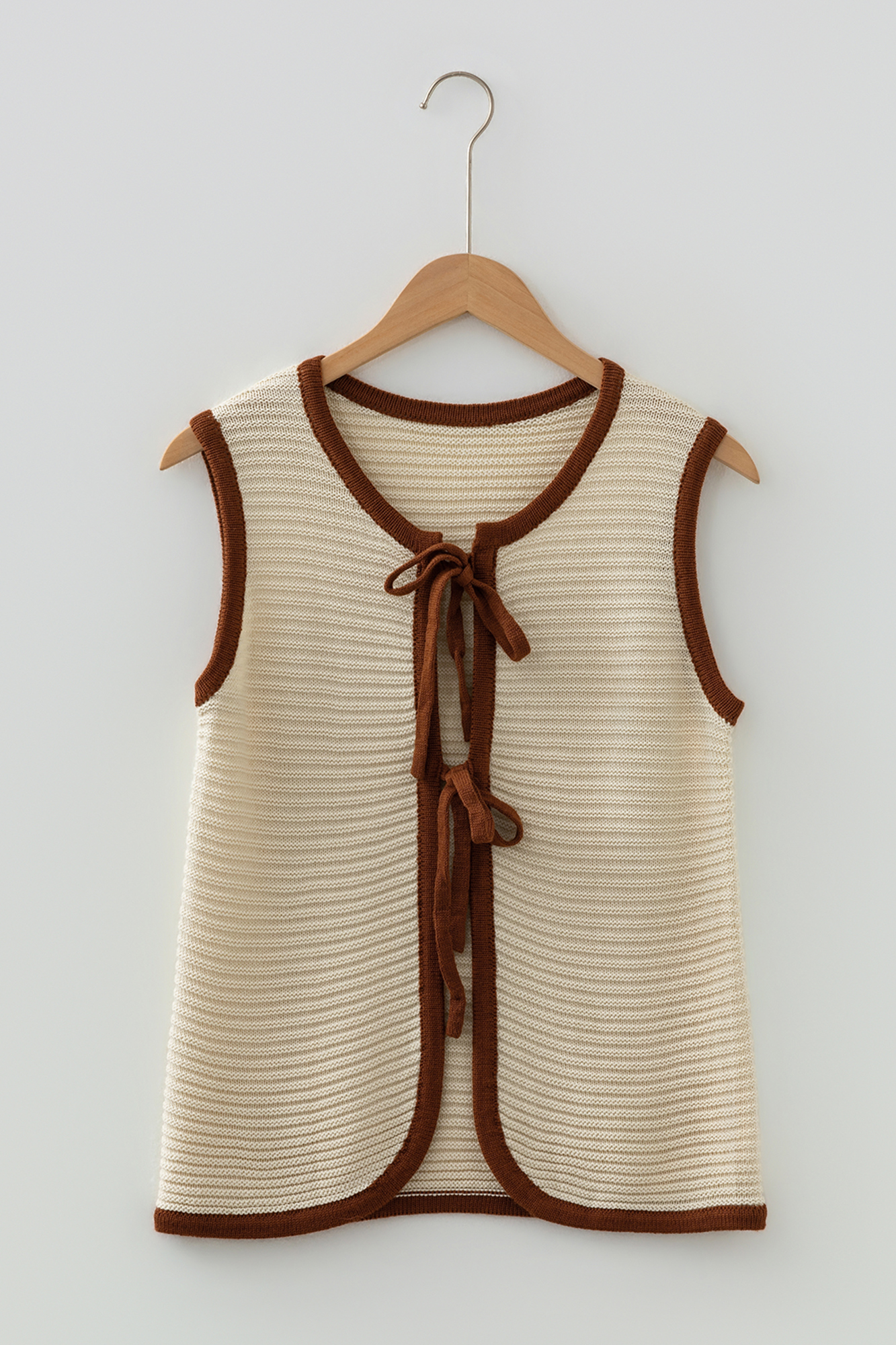 Aaliyah Trim Ties Front Sweater keeps things simple: cozy, flattering, and ready for wherever the day takes you. This sleeveless sweater is chic made with textured ribbed knit fabric. The contrast trim creates a colorblock vision and a structured silhouette. The ties front design is feminine and convenient. Easy to layer over shirts and tees for a chic look. Material: 55%Acrylic+45%Cotton.