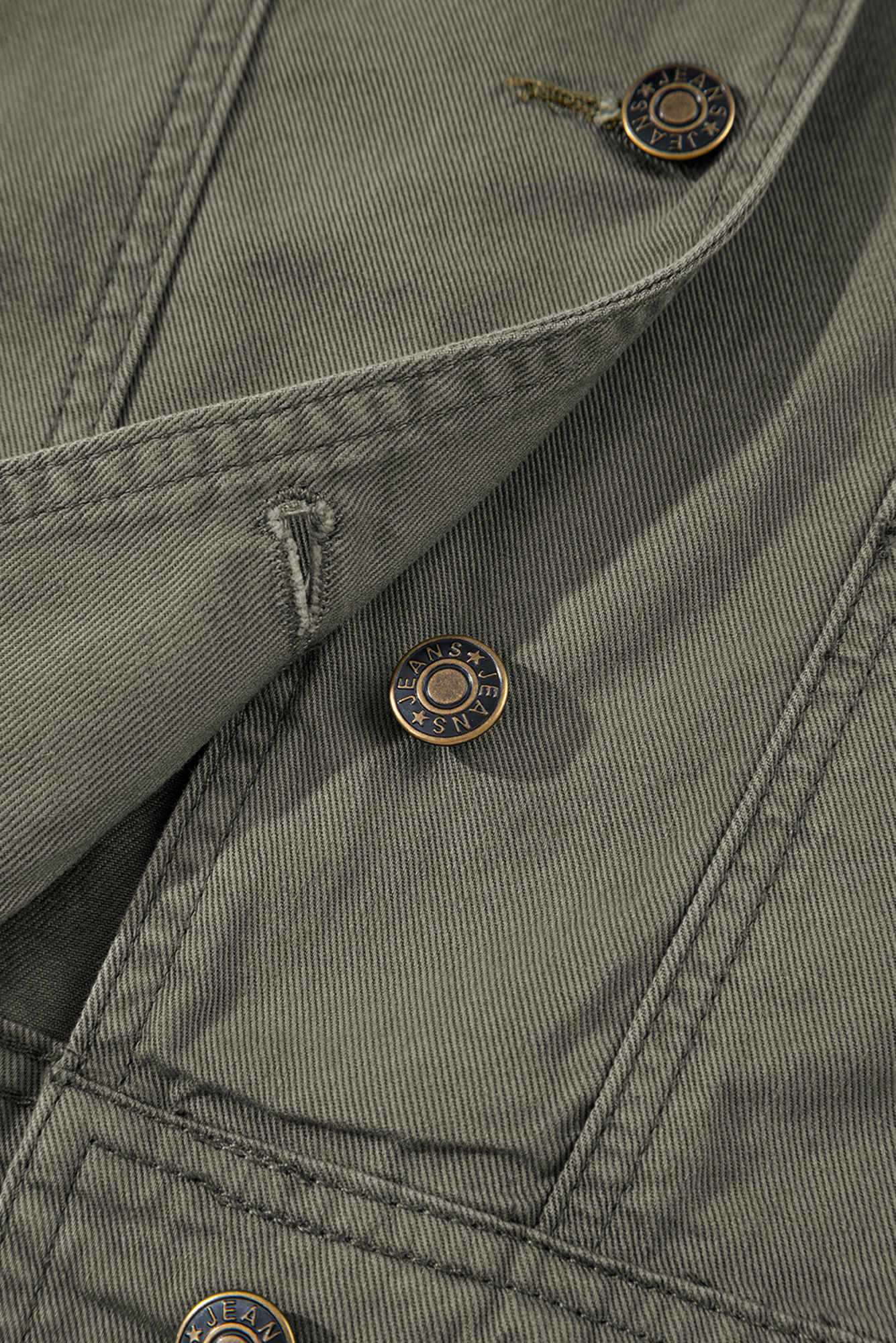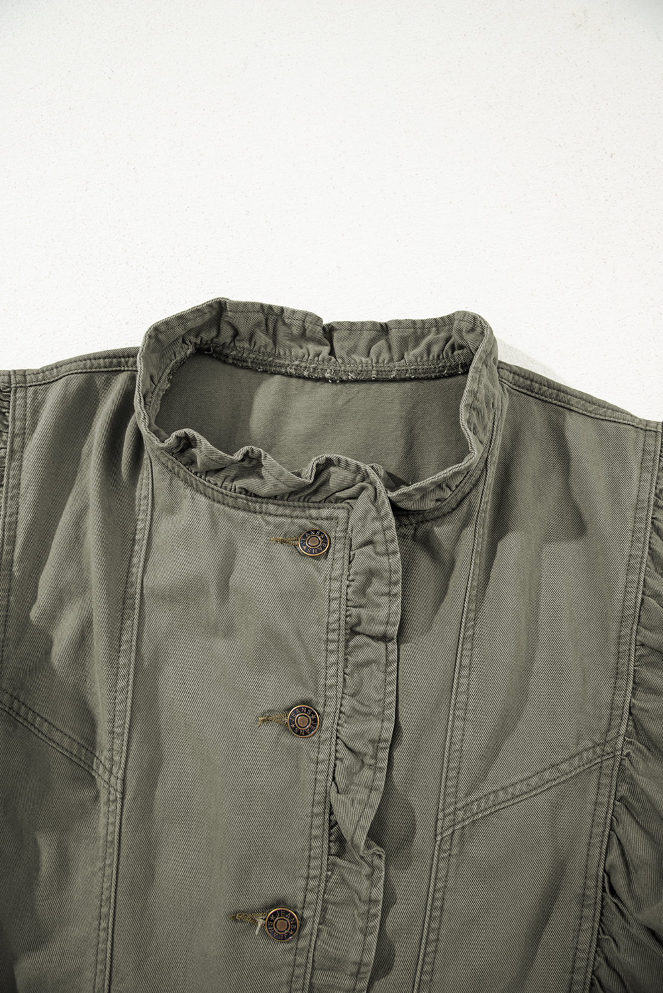 Meet Abigail Bay Ruffled Patchwork Jacket—effortless, flattering, and easy to style for everyday life. The ruffled decor adds feminine charm to this fashion denim vest. This jacket vest features a loose fit patchwork silhouette. The side pockets adds adornment and function to this jean vest. The metal buttons closure is fashionable and convenient. denim vests womens are fashion-forward and durable. Material: 100%Cotton.