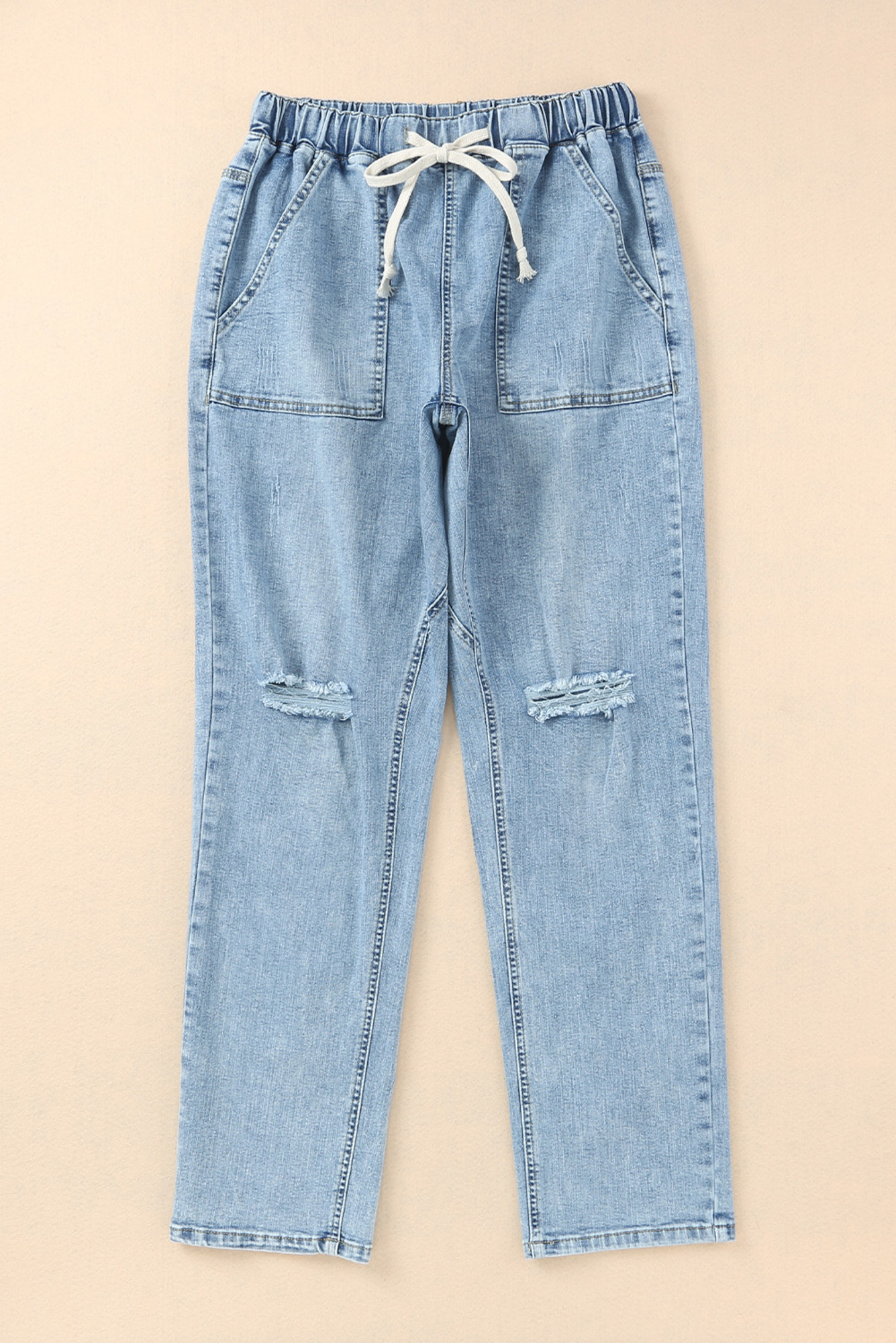Meet Aileen Gather Distressed Jogger—effortless, flattering, and easy to style for everyday life. Fit with an elastic drawstring waist A medium wash with light distressing and a relaxed fit Detailed with side and back pockets for optimal functionality A lightweight, generously cut jogger perfect for spring/summer jeans are popular to style with shirts or crop tops Material: 71%Cotton+27.5%Polyester+1.5%Elastane.