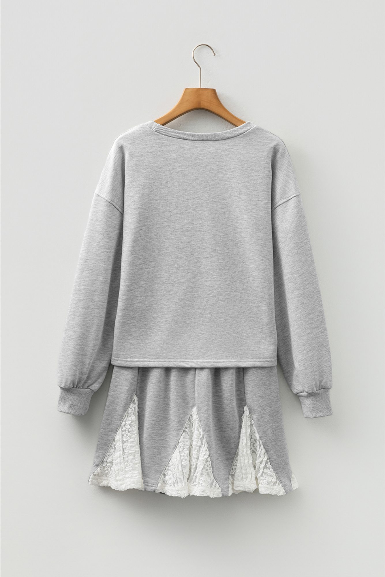 Meet Amelia Patchwork Drop Shoulder Pullover—effortless, flattering, and easy to style for everyday life. Add this lace patchwork outfit to your wardrobe. 2pcs set for women including a relaxed pullover and mini skort. The casual long sleeve top has an inverted triangle detail. While the drawstring skort has a ruffled lace hem patchwork. There are all kinds of two piece outfits for women cheaply . Material: 65%Polyester+35%Cotton.