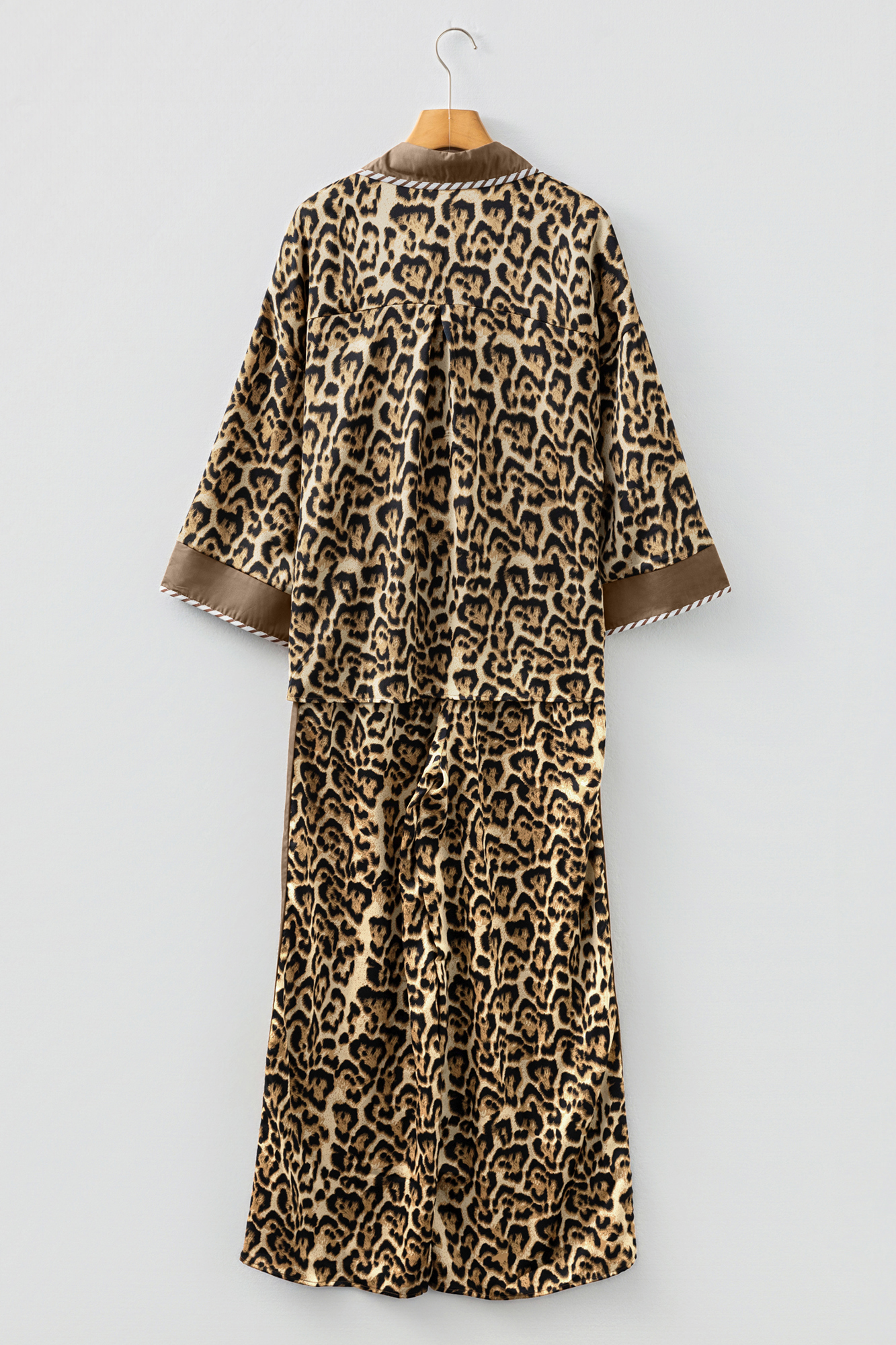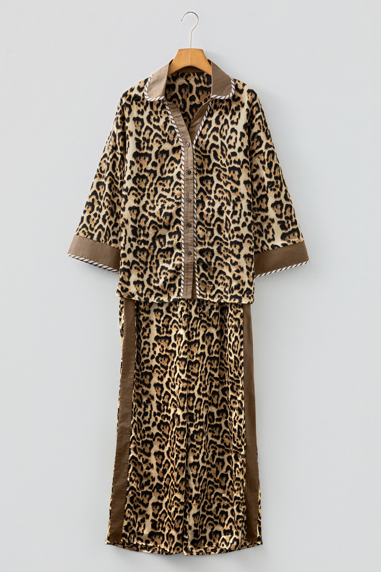 Make Annabelle 3 4 Sleeve Shirt your grab-and-go choice for effortless, everyday dressing. Unleash your wild side in this leopard coordination set. This fierce ensemble includes a ¾ sleeve shirt with a high-waisted wide leg pant. The leopard print makes this top and pants set wild free to make a fashion statement. This two-piece pants set is sleek and comfortable with fine quality. Material: 100%Polyester.