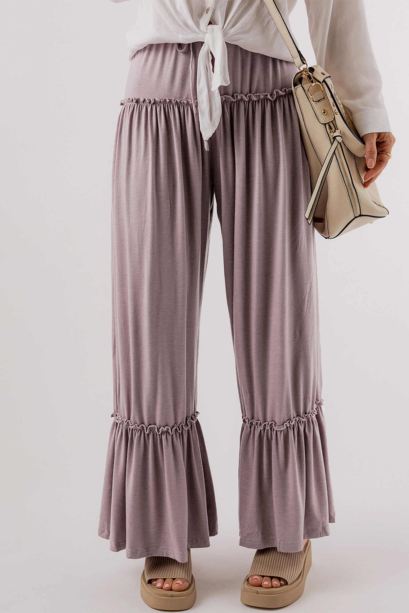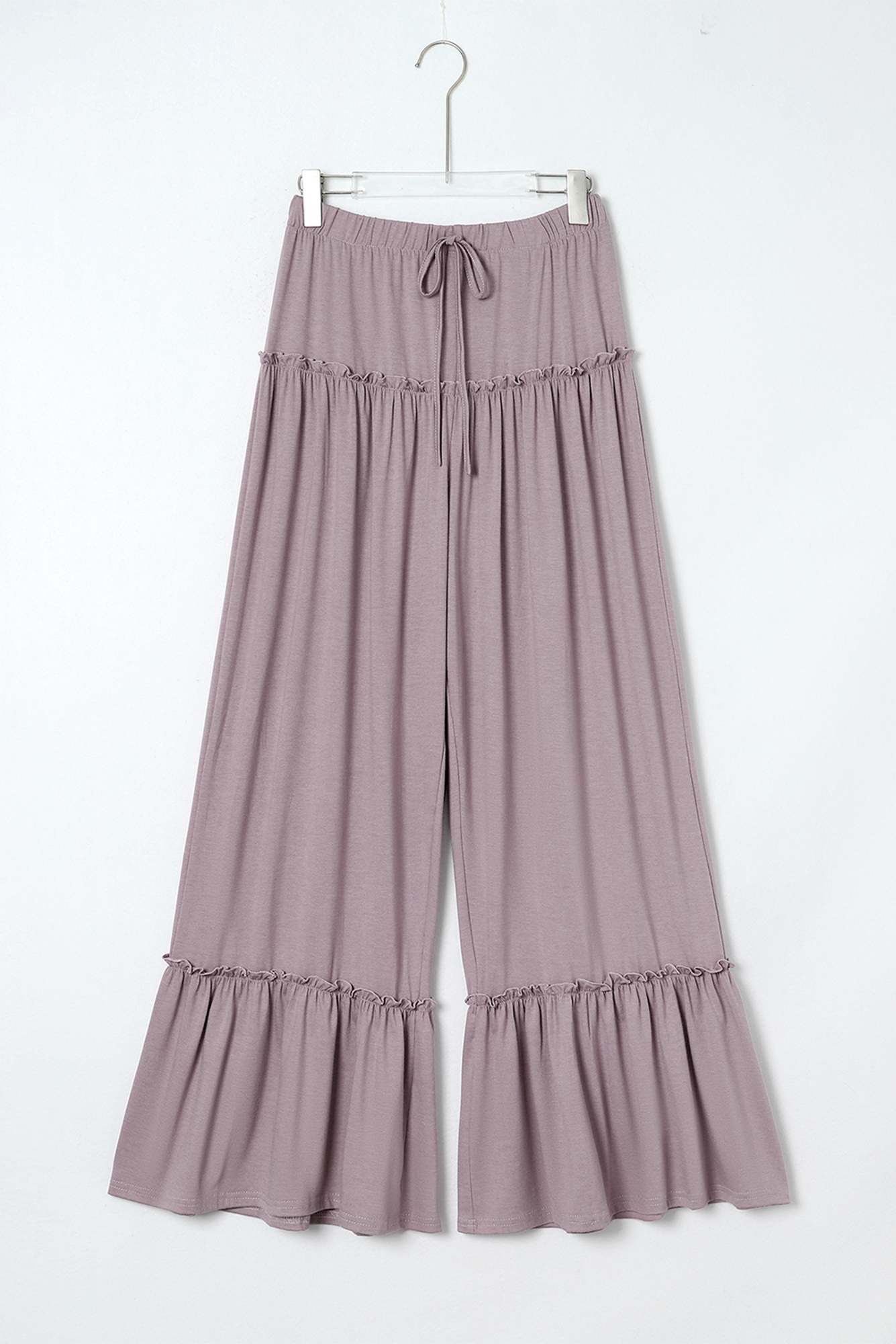 Meet Aurora Waist Wide Leg Pants—effortless, flattering, and easy to style for everyday life. Featuring frilled details, the casual pants add a feminine and playful touch Designed with a flattering high waist, they accentuate your curves The wide-leg design adds a touch of elegance and sophistication Crafted from a flowy fabric, it offers comfort and ease of movement womens pants strike the perfect balance between chic and casual Material: 65%Polyester+30%Viscose+5%Elastane.
