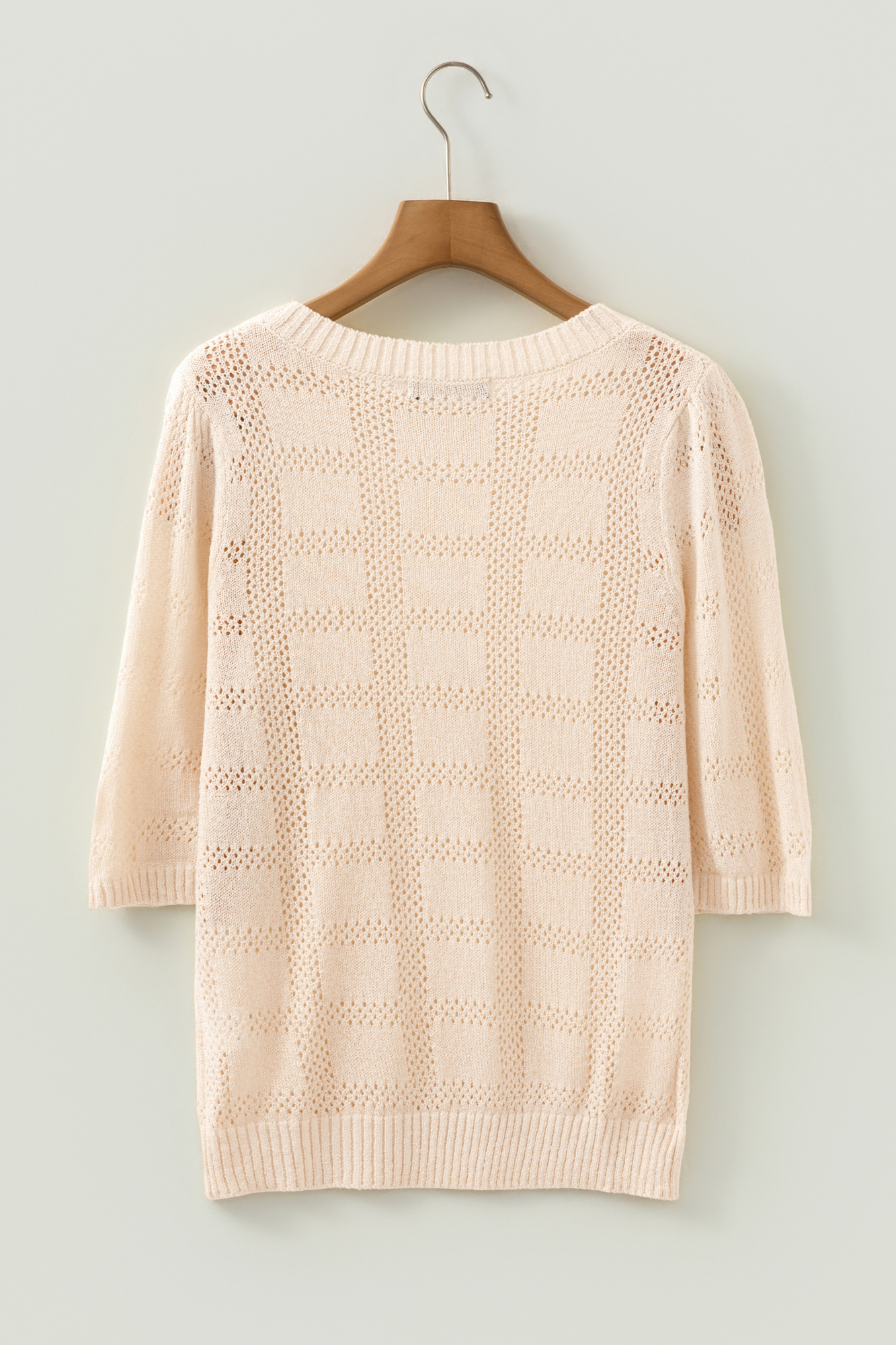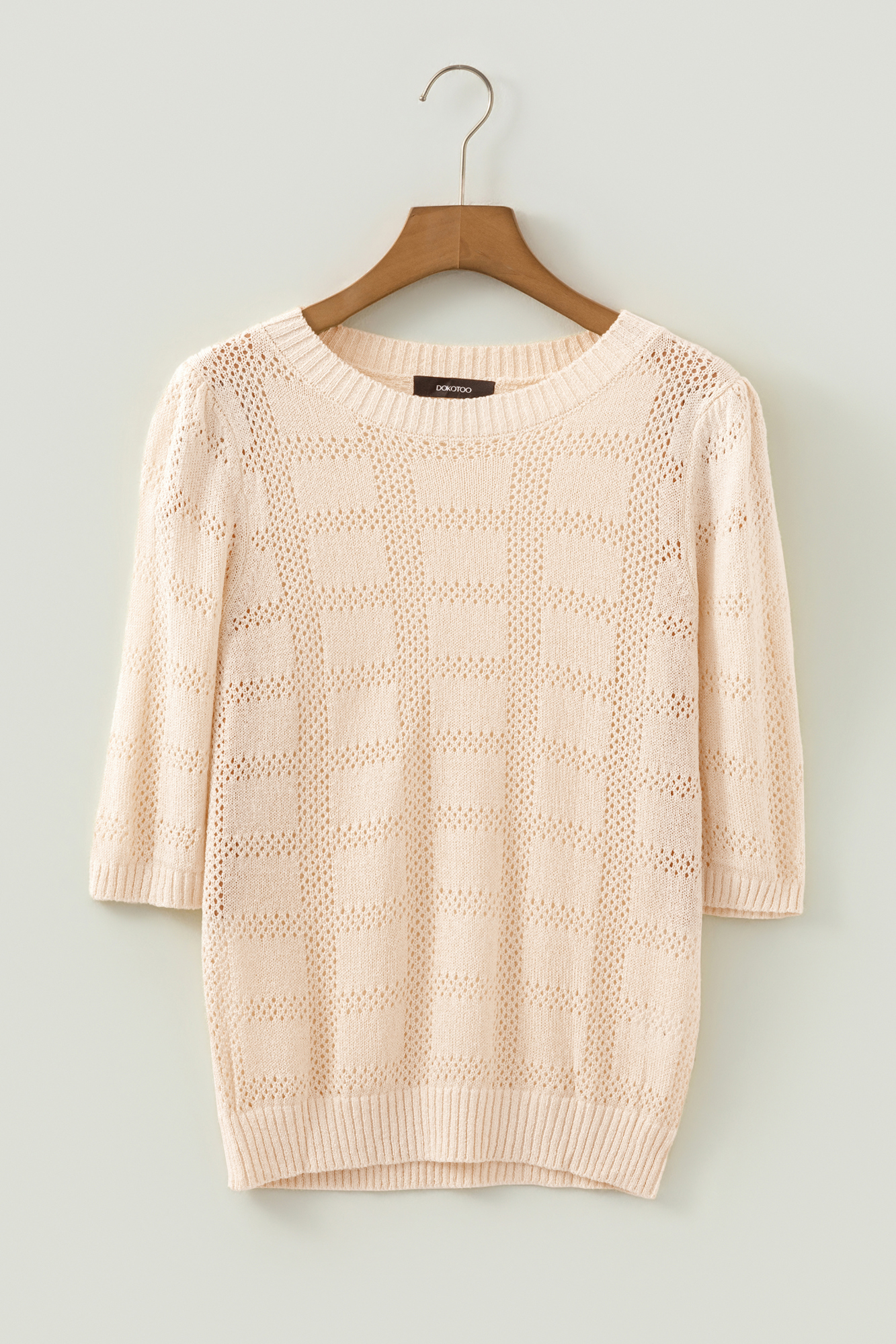 With Belen Knit Short Sleeve Sweater, getting dressed is as simple as slip on, style, and go. Unique plaid crochet knit adds handcrafted charm to this knitted t shirt. Short sleeve makes it perfect for spring, summer, and early fall layering. Soft, breathable knit offers comfortable wear with a stylish textured look. Ribbed trims enhance durability while maintaining a structured shape. Material: 75%Acrylic+25%Cotton.