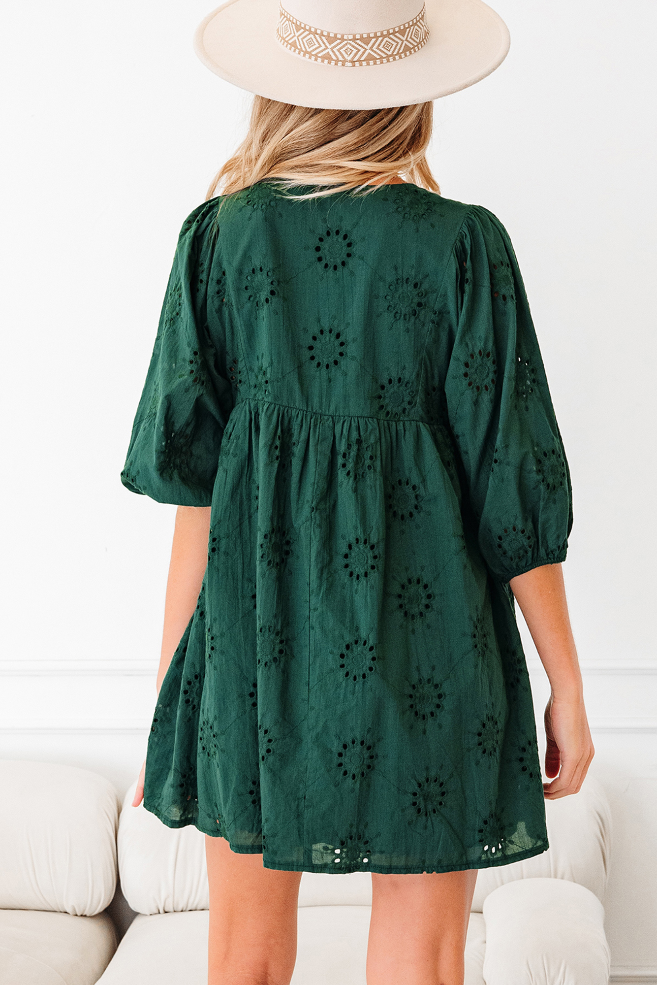 Meet Beth Sleeve Swing Mini Dress—effortless, flattering, and easy to style for everyday life. Features delicate embroidered eyelet details for a feminine silhouette. 3/4 puffy sleeves add volume and charm to this swing mini dress. Breezy babydoll silhouette offers comfort and style for day-to-night wear. Perfect for daily, brunch, vacations, parties etc. Mini dresses with sleeves for fall. Material: 100%Cotton.