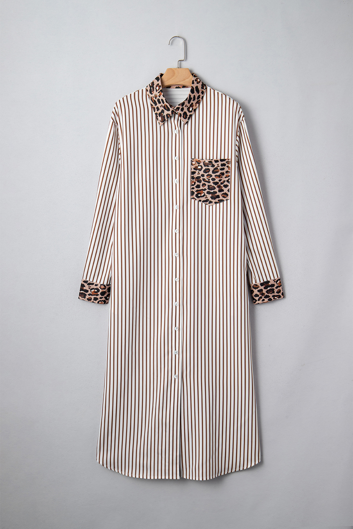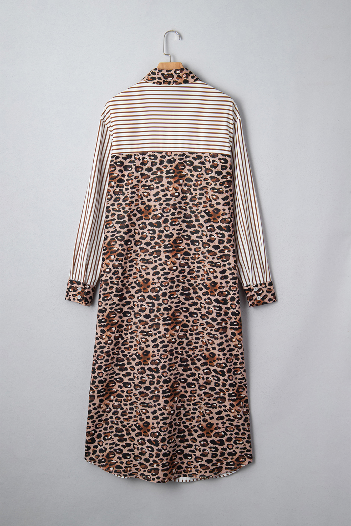 Slip into Caroline Contrast Patchwork Long Shirt Dress—soft, easy, and perfect for busy days on the go. The pinstriped pattern makes this long dress more flattering and slender. The leopard patchwork creates a bold, artistic statement. Flowy shirt dress design offers effortless, versatile styling. Side slits allow comfortable movement and dynamic flair. Material: 100%Polyester.