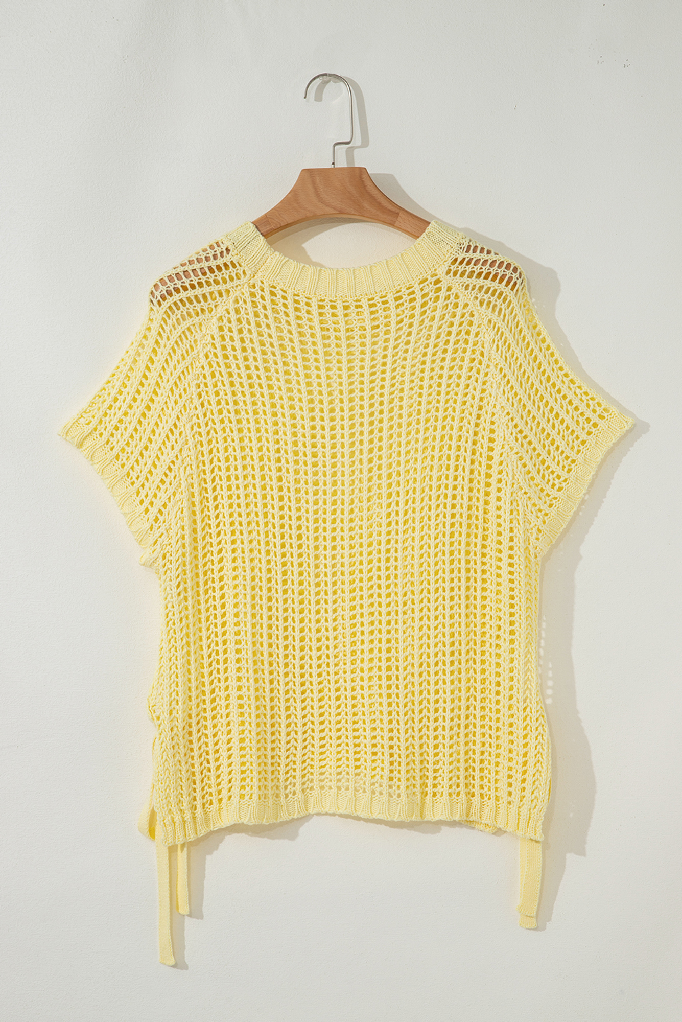 Let Celine Tied Short Sleeve Sweater do the work for you on days you want instant style with zero fuss. This hollow-out crochet sweater is sexy and elegant. It features a relaxed fit style with short sleeves. The tied side design is flexible and fashion-forward. Perfect to pair with jeans and skirts for a complete look. Material: 100%Acrylic.