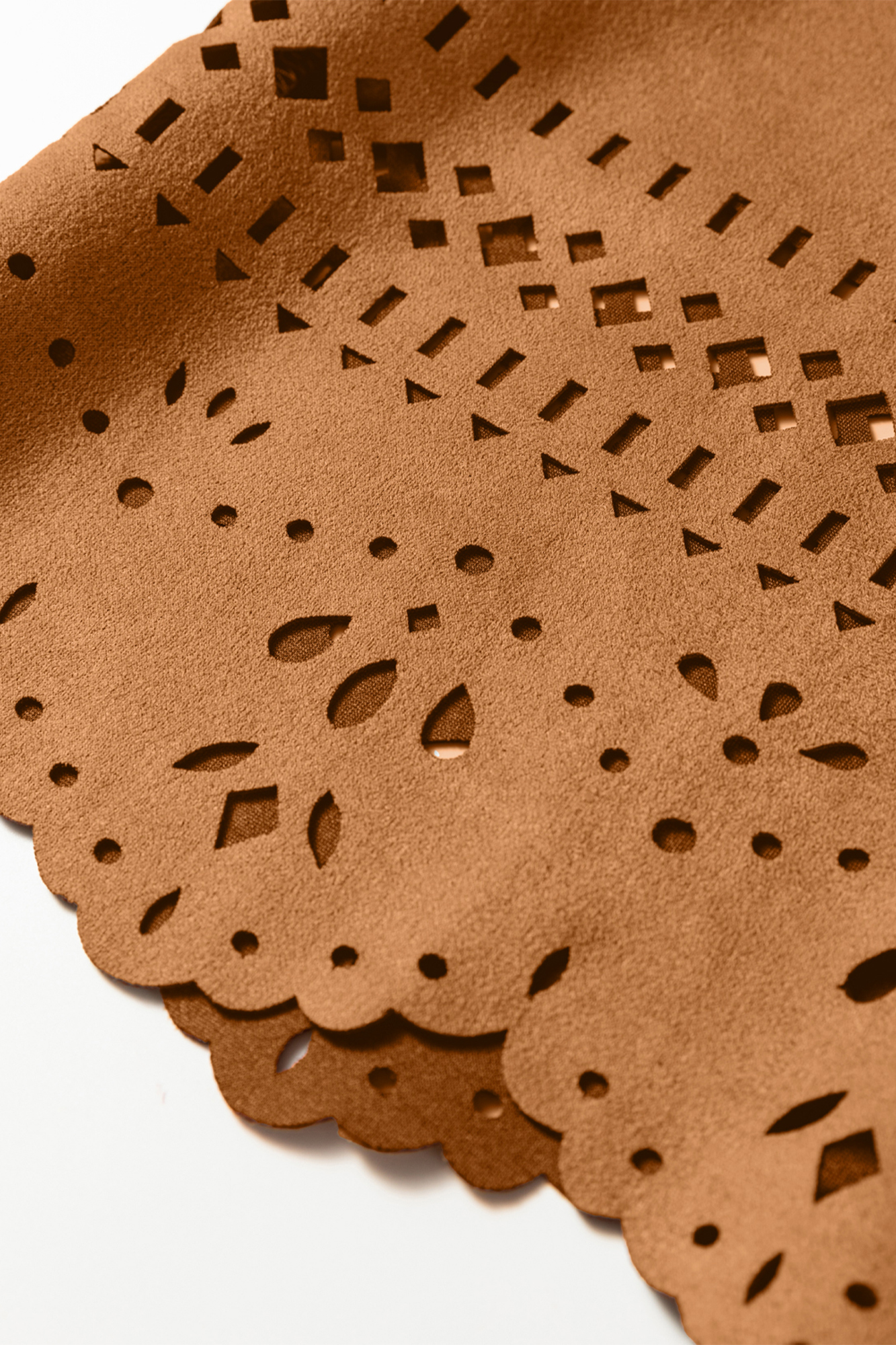 Introducing Ellianna Detail Retro Style Jacket—the perfect blend of casual comfort and put-together style. Faux suede offers retro flair and vegan-friendly appeal. Hollowed detailing creates unique delicate charm. Solid color design ensures versatile, easy pairing. Tailored construction provides stylish layering options. Material: 95%Polyester+5%Elastane.