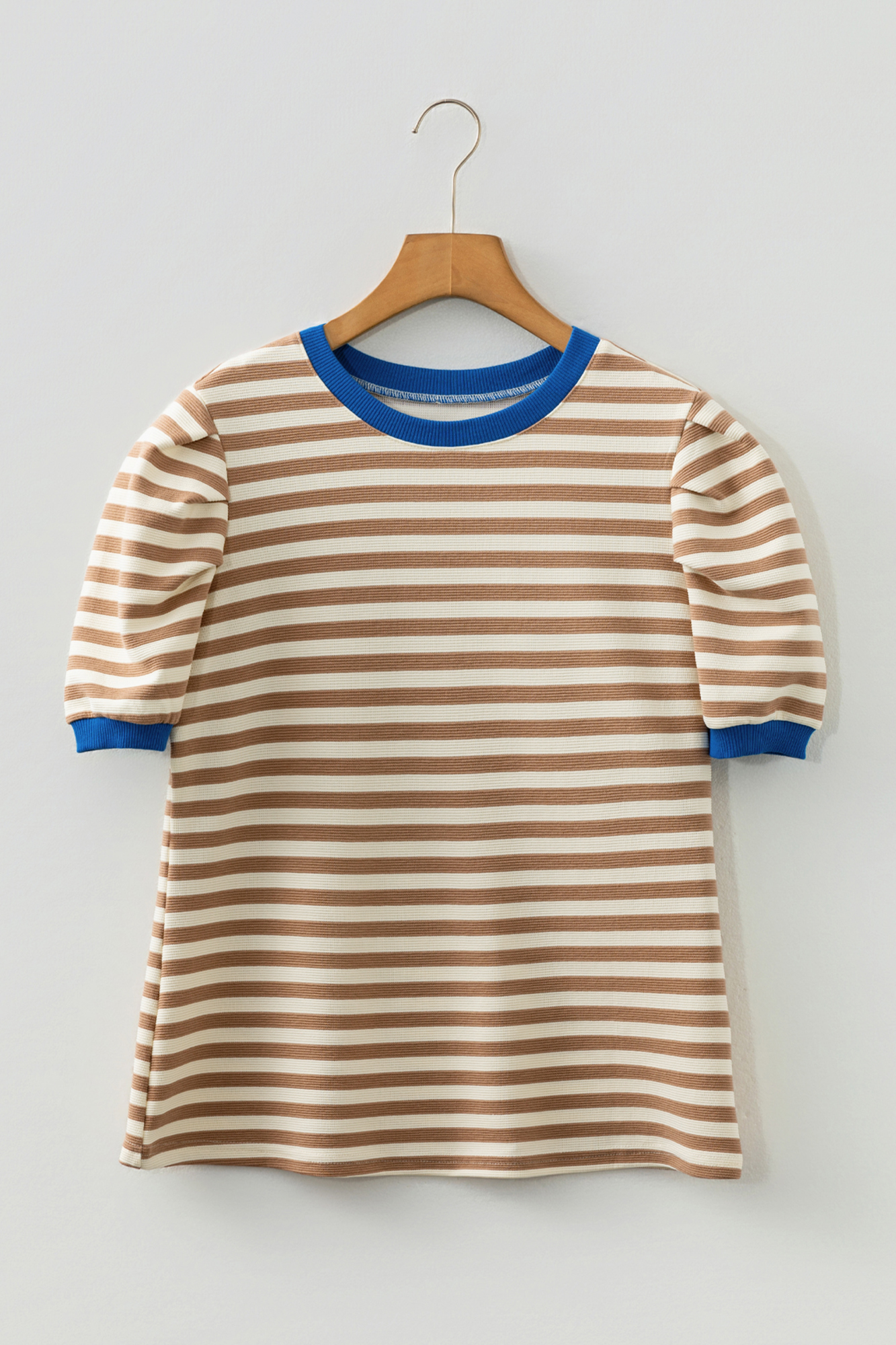 Keep it simple in Elora Sleeve Contrast Trim Tee—an easy favorite you’ll keep in regular rotation. Classic striped tee with puff sleeves and contrast trim for a playful vibe. Round neck design gives a clean, classic look for everyday wear. Soft, stretchy fabric offers comfort and a flattering fit. Perfect casual top to pair with jeans, shorts and skirts. Material: 62%Polyester+32%Cotton+6%Elastane.