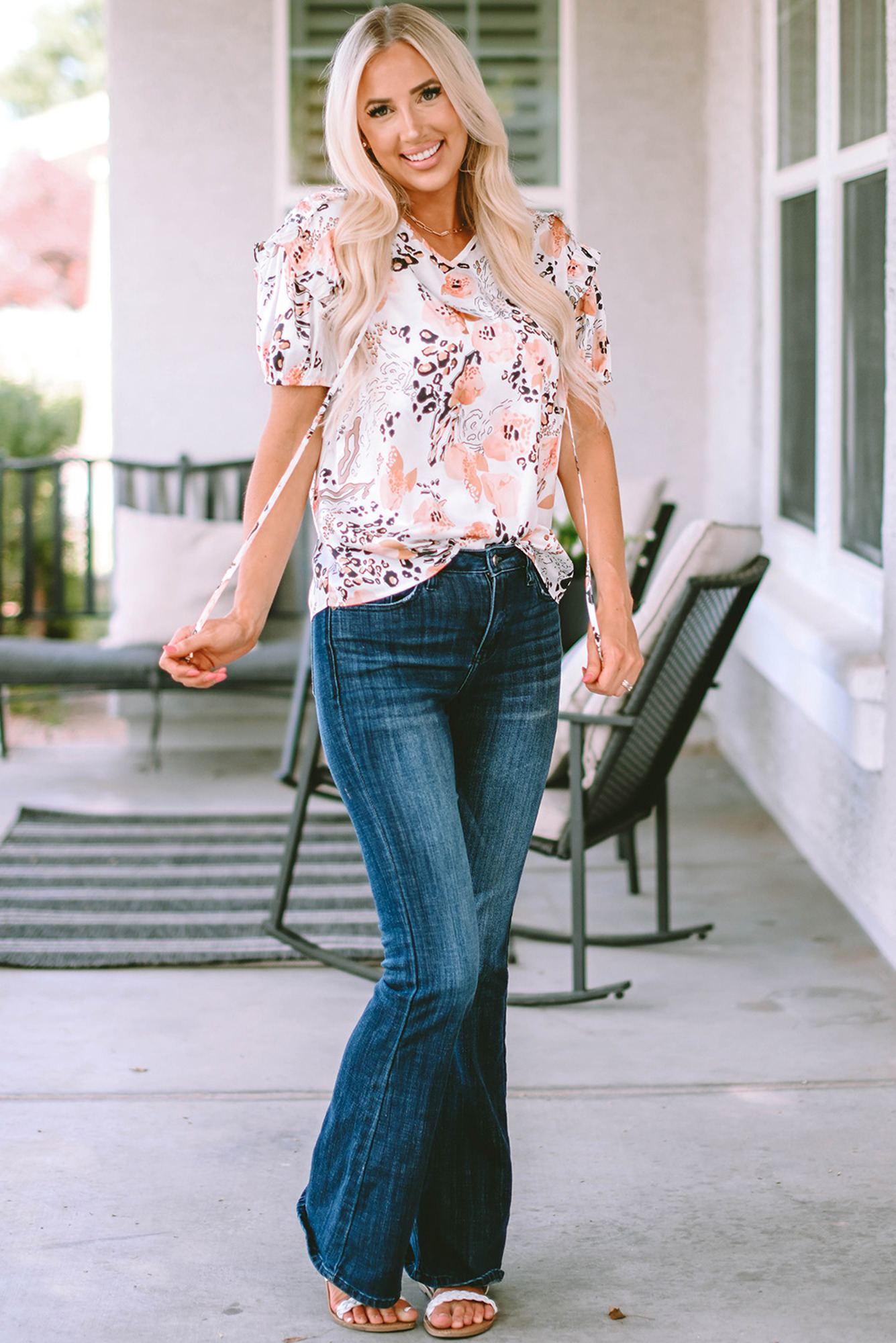 Reach for Emely Print Puff Sleeve Blouse whenever you want an easy win for your wardrobe. This printed blouse offers a stylish and sophisticated look The ruffles on the shoulder and neckline add a romantic touch Leopard and floral patchwork pattern for a bold and eye-catching statement High-quality fabric makes the blouse lightweight and comfortable to wear blouses are easy to mix and match with different outfits Material: 95%Polyester+5%Elastane.