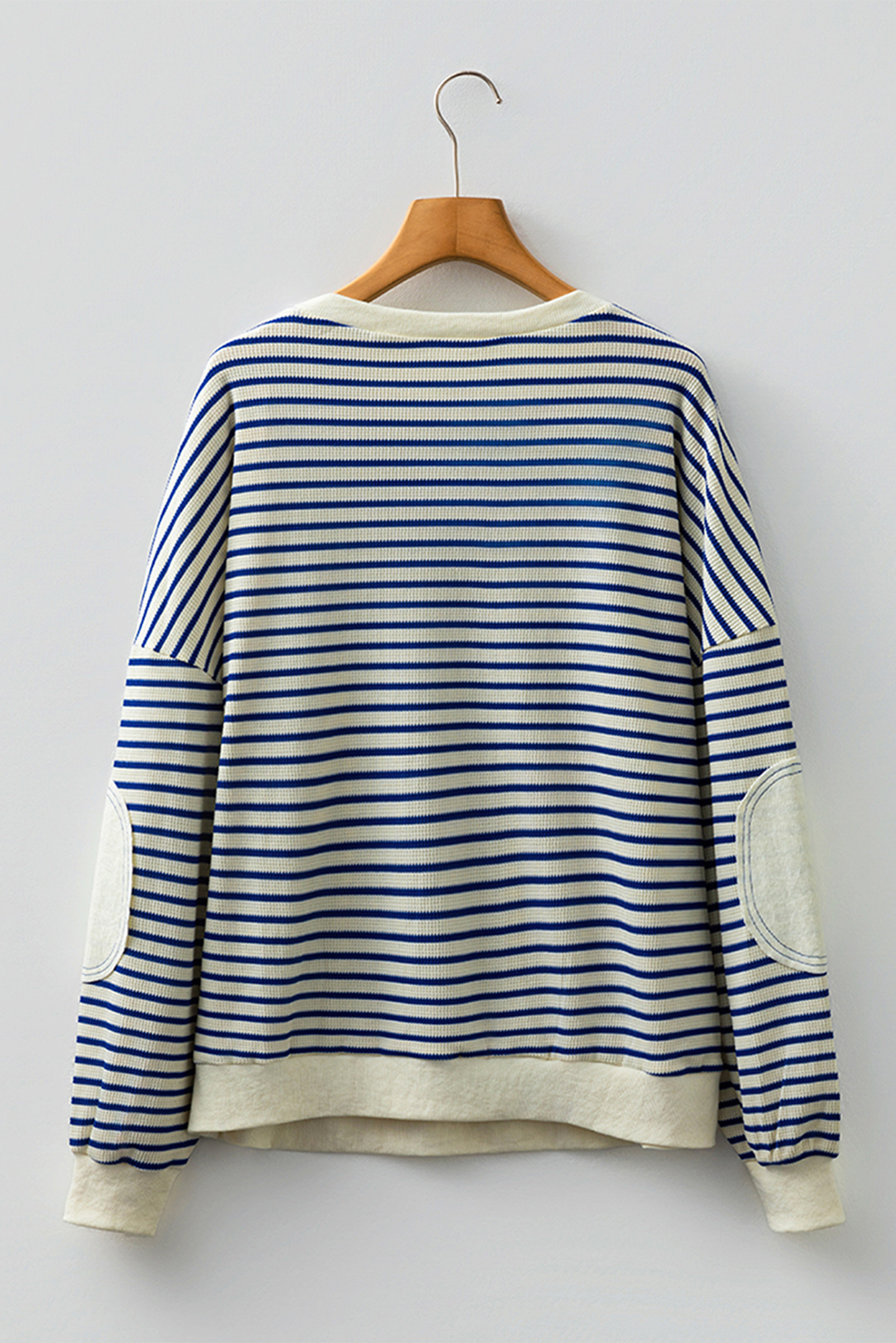Meet Emily Patched Drop Shoulder Sweatshirt—effortless, flattering, and easy to style for everyday life. Textured fabric adds visual depth and casual appeal. Striped pattern makes this pullover top classic and timeless. Contrast elbow patches provide retro classic styling. Drop shoulder cut ensures relaxed comfortable fit. sweatshirts offer versatile easy layering options. Material: 95%Polyester+5%Elastane.
