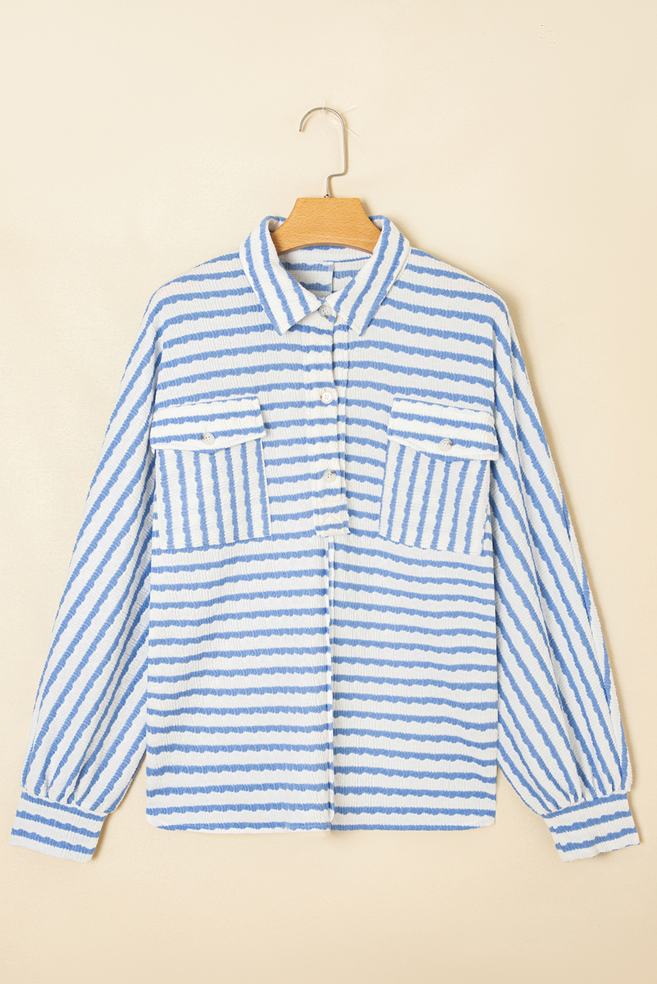 Reach for Emma Chest Loose Fit Blouse whenever you want an easy win for your wardrobe. This loose fit top is perfect for any body shape to look slim. The chest pocket design is decorative and practical. Half buttons front and collared design for a chic casual look. This striped top is classic and timeless. Material: 85%Polyester+10%Viscose+5%Elastane.