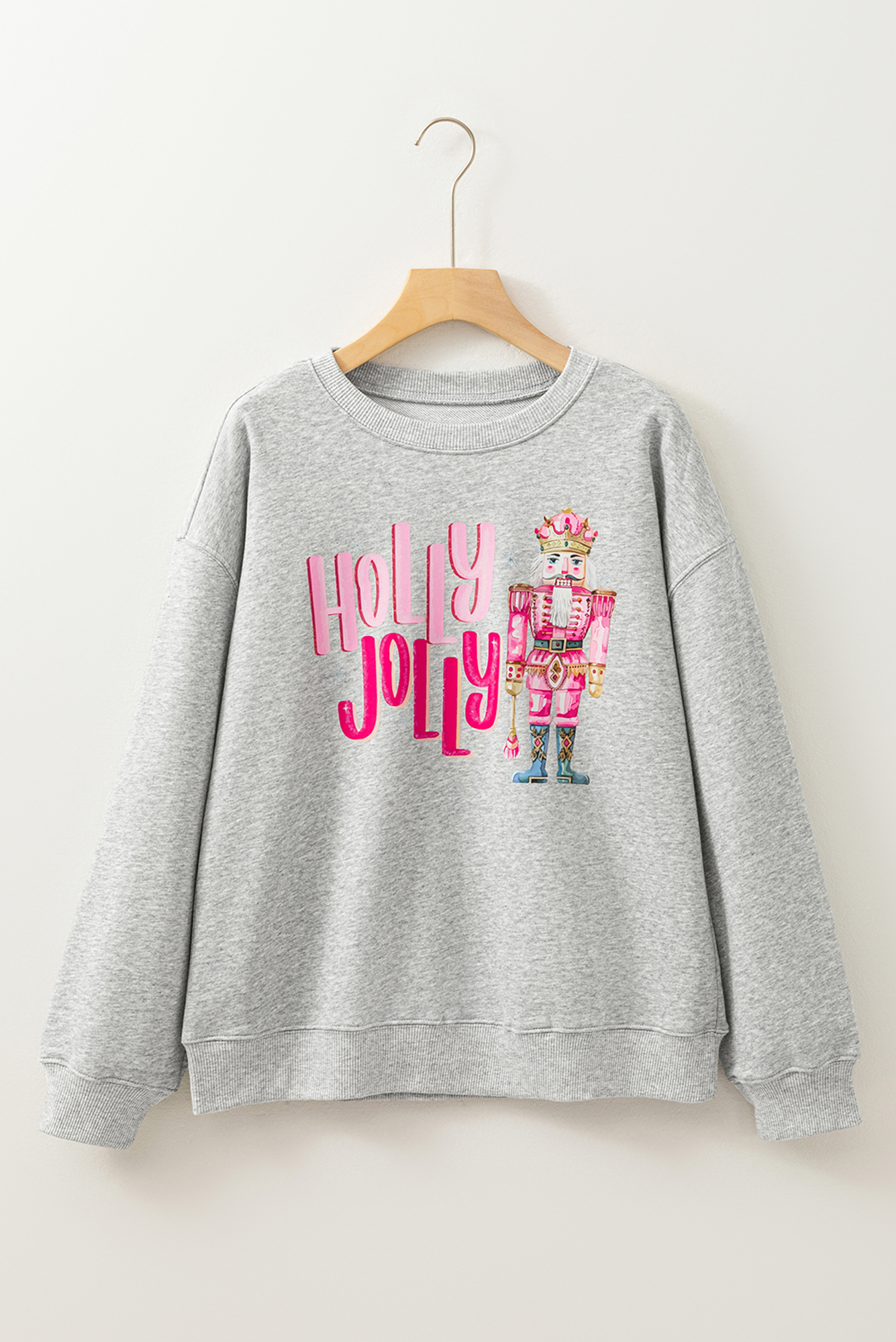 Meet Emma Nutcracker Print Christmas Sweatshirt—effortless, flattering, and easy to style for everyday life. The Christmas sweatshirt keeps you in style this season. The nutcracker and “HOLLY JOLLY” prints add a playful touch. The baggy fit and a crew neck accommodate different body shapes. Pair it with jeans or casual pants to embrace the Christmas spirit. graphic sweatshirts are ideal for various activities in the festive season. Material: 50%Polyester+50%Cotton.