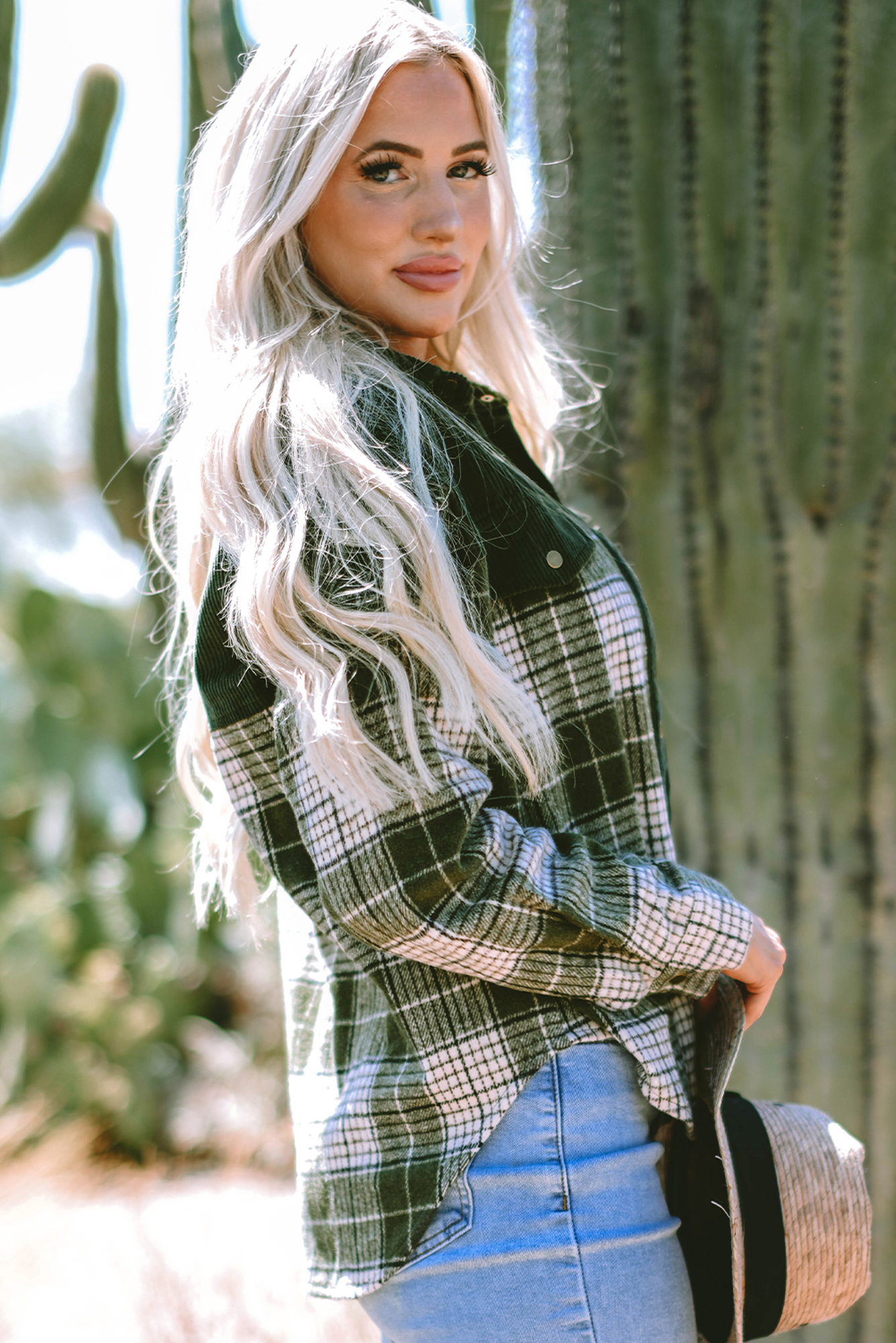 Meet Emma Snap Colorblock Plaid Shacket—effortless, flattering, and easy to style for everyday life. This plaid jacket is combined with trendy corduroy patchwork. Unique colorblock design for a modern and eye-catching look. Convenient snap buttons for easy closure and a casual vibe. Classic shirt collar adds a touch of sophistication to the style. jackets feature captivating patterns and textures. Material: 100%Polyester.