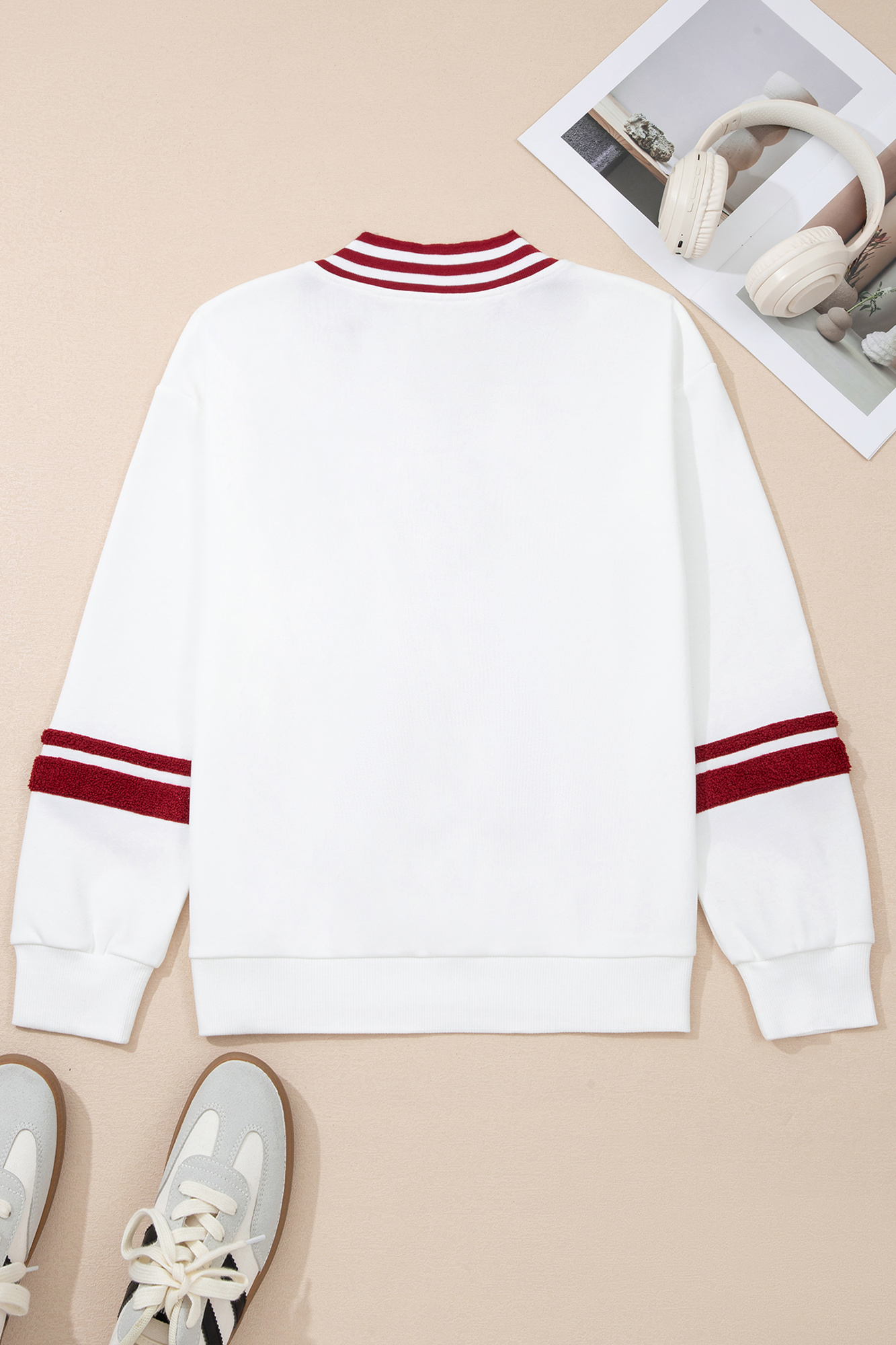 Esme Striped Puff Sleeve Sweatshirt is designed to move with you and keep you comfortable all day long. Stay cozy and stylish on the game day in this varsity sweatshirt. This pullover sweatshirt features an eye-catching chenille A graphic on the front. The striped detail at neckline and sleeves create a chic varsity style. It pairs well with any bottom such as denim shorts, jeans, sweatpants and other casual pants. Material: 65%Polyester+35%Cotton.