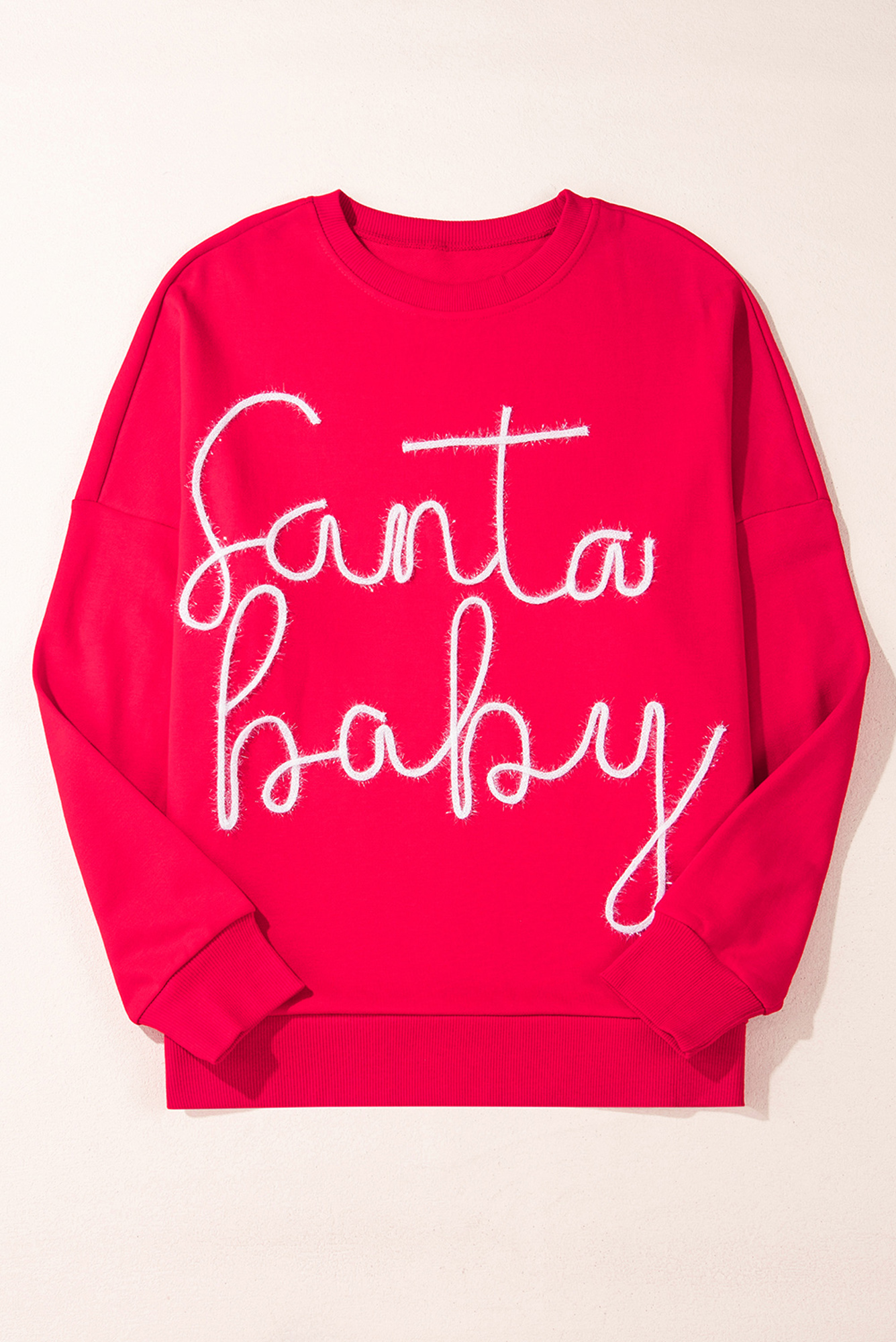 Meet Evelyn Baby Tinsel Graphic Sweatshirt—effortless, flattering, and easy to style for everyday life. The vibrant red hue instantly evokes the festive spirit. The whimsical "Santa Baby" message adds a delightful and charming twist. This oversize sweatshirt is highly recommended to the . Suitable for cozying up by the fireplace or attending a festive party. sweatshirts for women with unique patterns. Material: 65%Polyester+35%Cotton.