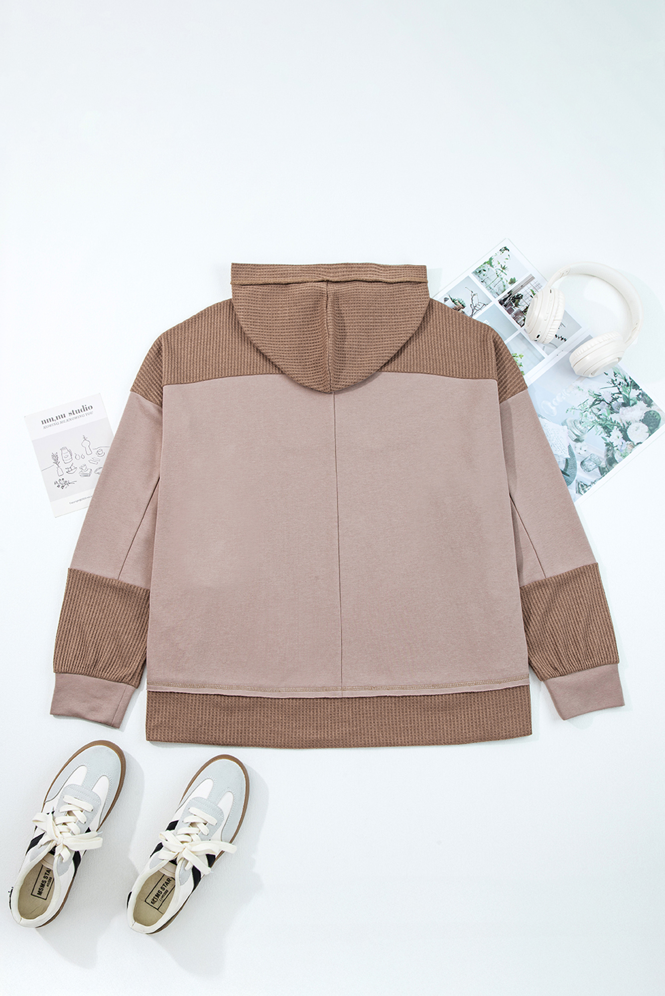 Meet Goat Waffle Contrast Patchwork Plus Size Pocketed Hoodie—effortless, flattering, and easy to style for everyday life. Take your style to the next level with this hoodie. This unique top has a waffle knit fabric patchwork. Retro pullover with mineral wash and raw seam details. Stand out from the crowd with this must-have top for women. plus size sweatshirts cheaply online. Material: 65%Polyester+35%Cotton.