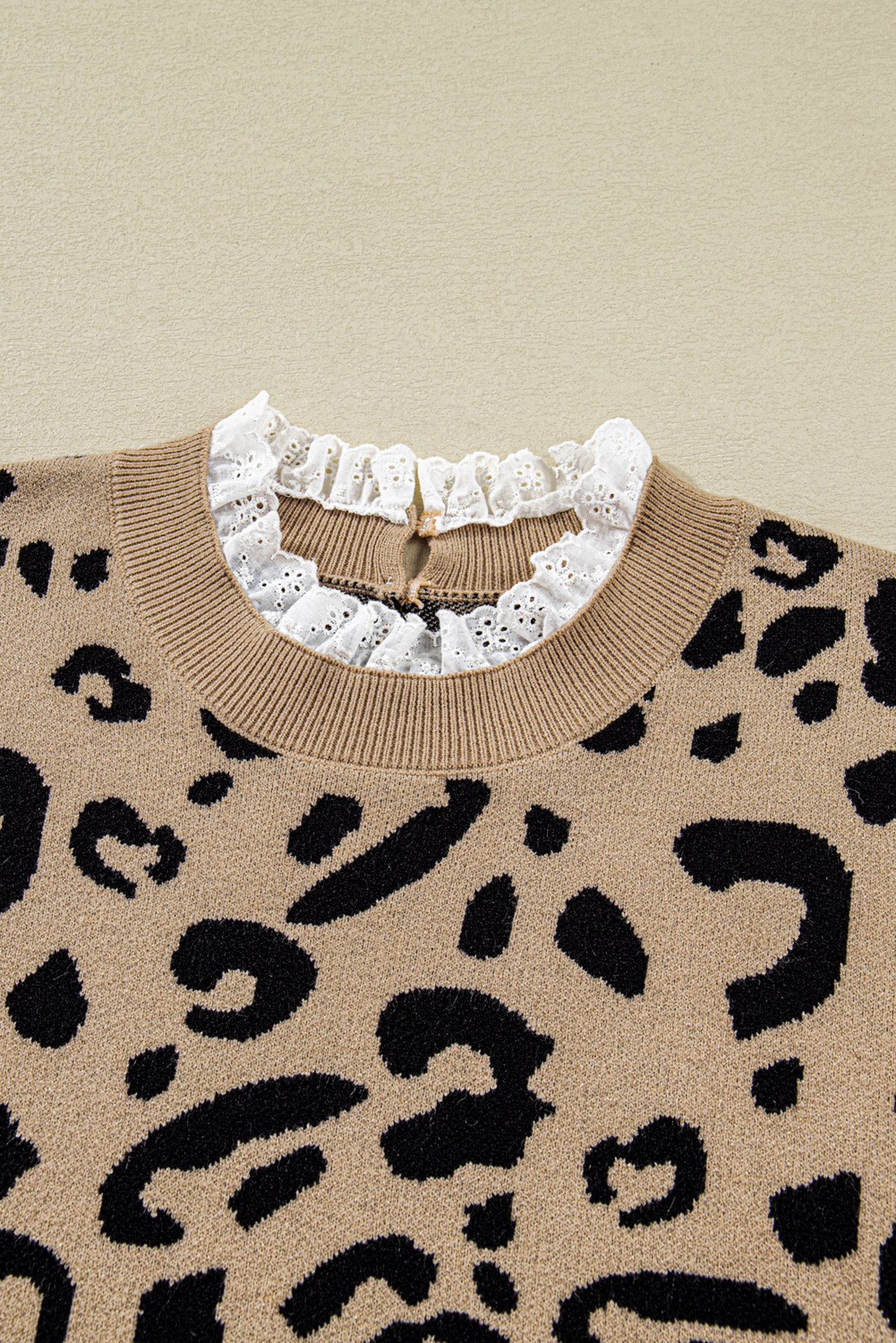Dress in Halle Lacy Trim Cuffed PLUS Sweater when you want a relaxed fit that still feels polished. The lacy trim adds feminine charm to this animal sweater. This knit sweater is fashionable and wild with leopard print. The buttoned cuffs also adds it chic and unique detail. Not only stylish but also practical to wear. Material: 50%Acrylic+27%Polyester+23%Polyamide.