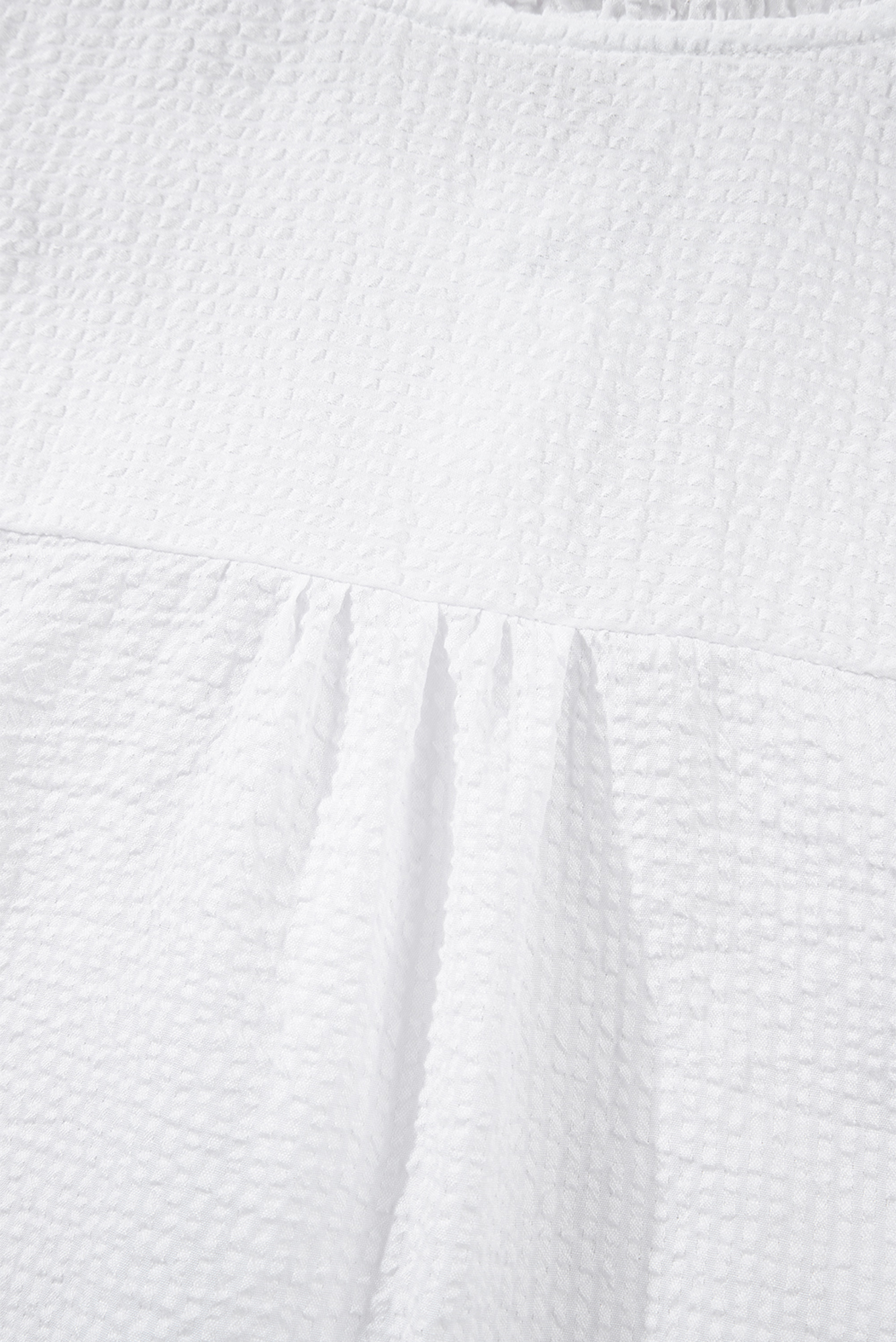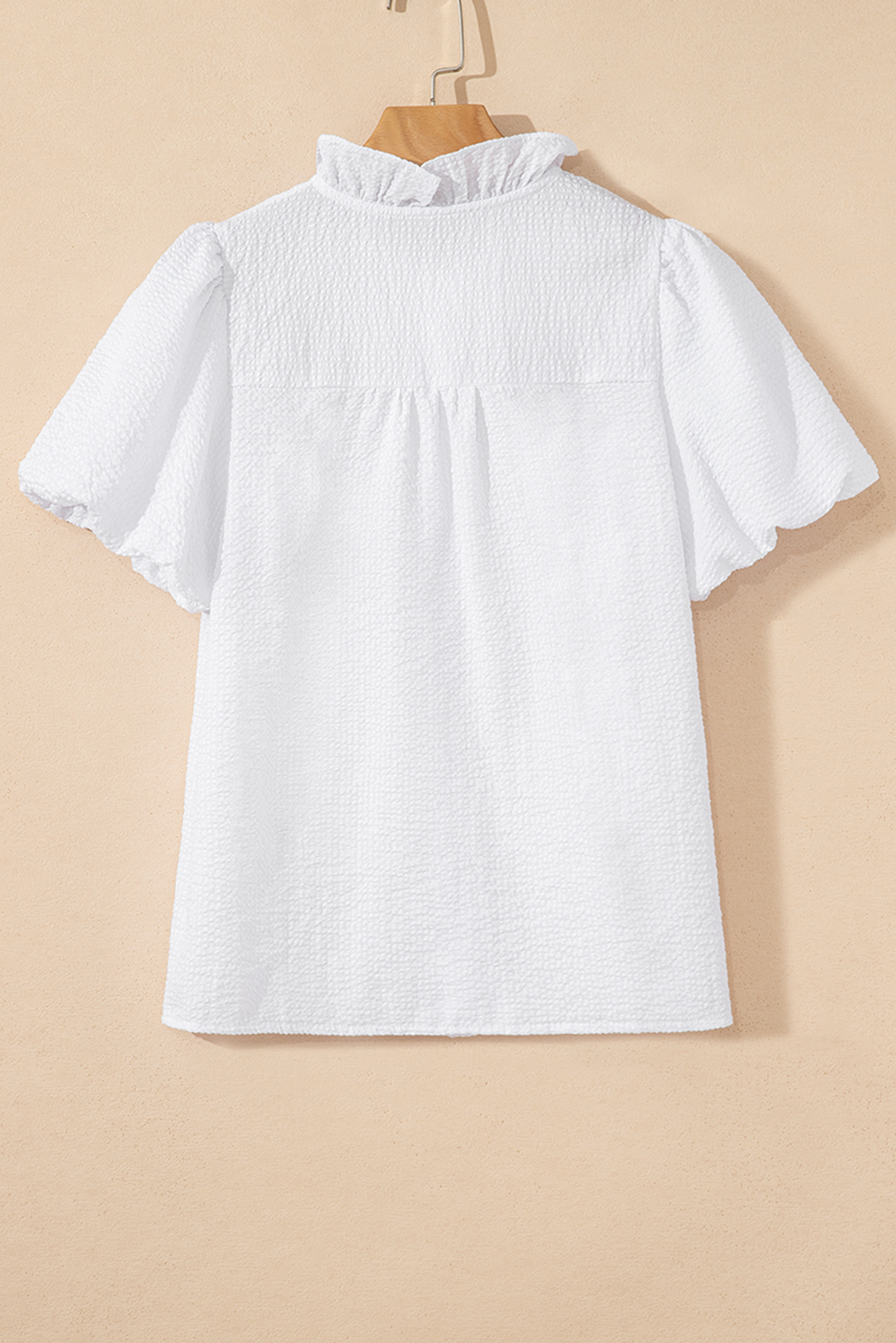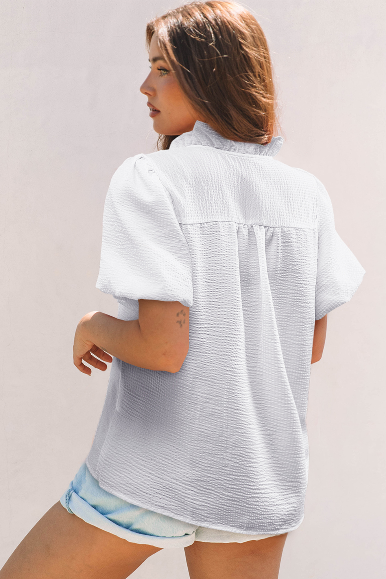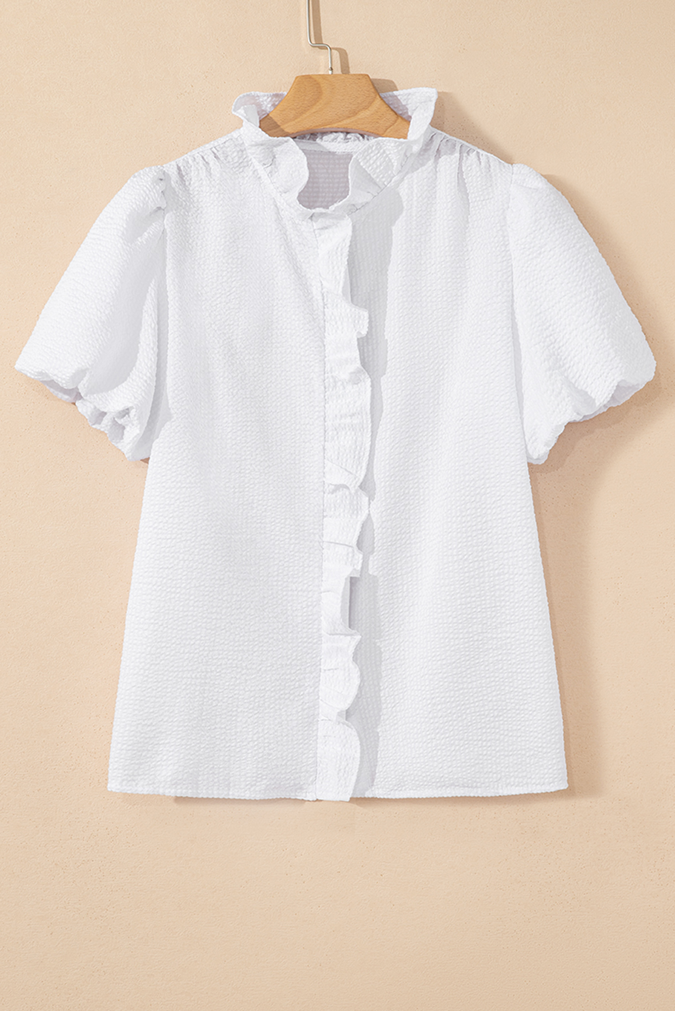 Hallie Short Bubble Sleeve Shirt is made for real life—easy to wear, easy to love. This striped shirt is perfect for both casual and dressy summer occasions. It features ruffled collar and the ruffled trim goes straight down. The short bubble sleeves makes this summer shirt with ultra feminine charm. Pair elegantly with jeans, skirt or suit pants. Material: 100%Polyester.