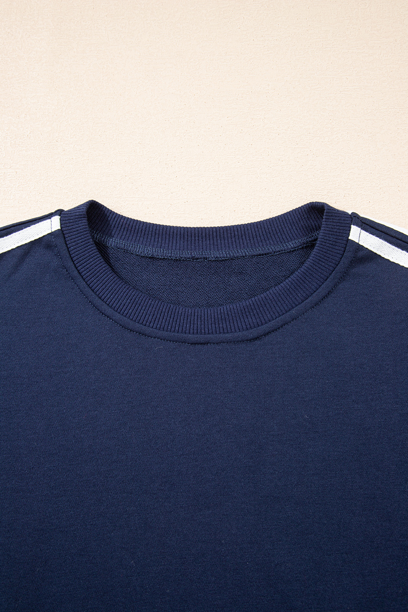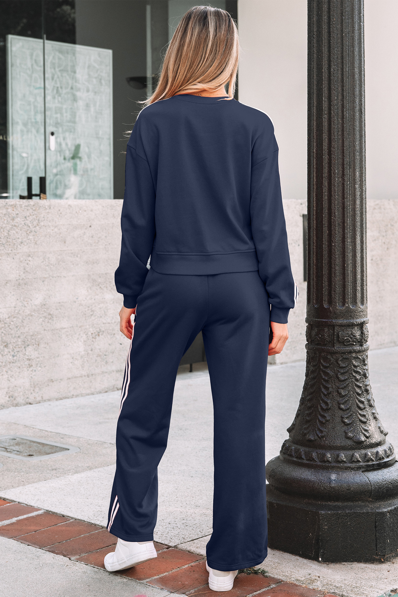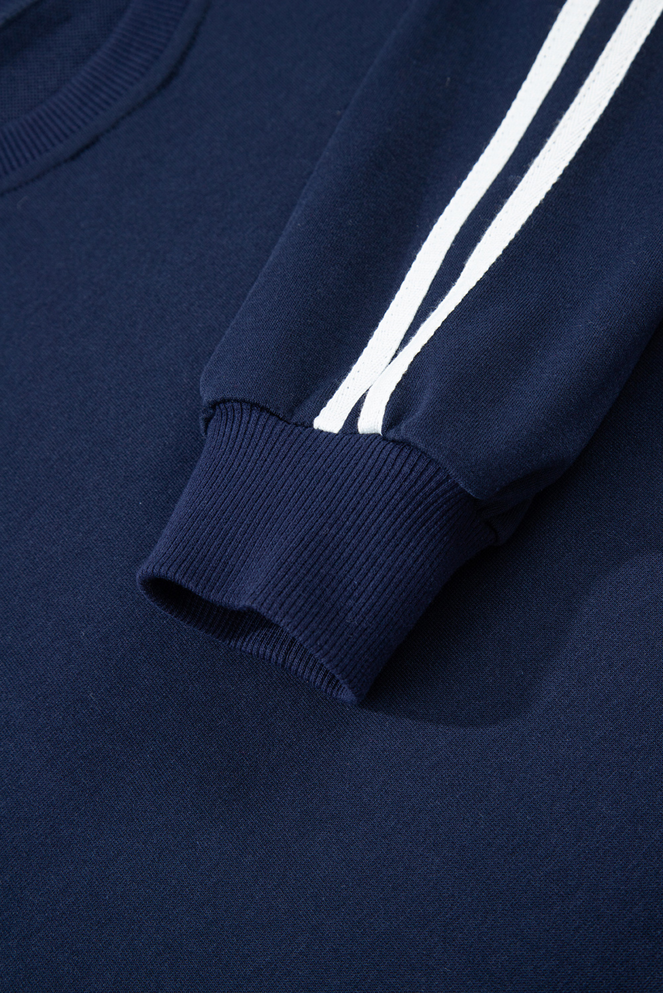 Make Hana Striped Detail Crewneck Pullover your grab-and-go choice for effortless, everyday dressing. Stylish varsity striped two piece set adds a sporty vibe. Crewneck pullover offers cozy comfort for daily wear. High-waisted elastic sweatpants ensure a snug fit. Ideal for errands, workouts and relaxing. Material: 65%Polyester+35%Cotton.