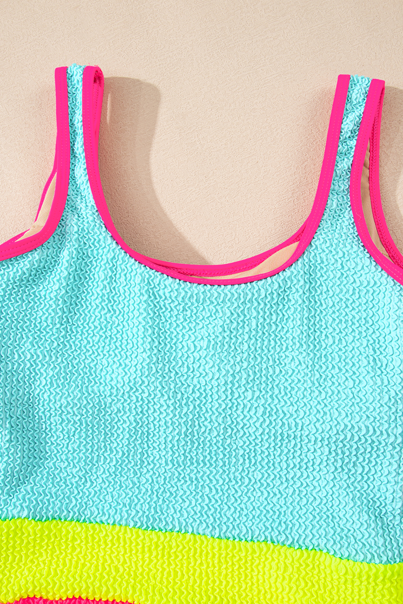Stay comfy and put-together all at once in Hanna Patchwork One Piece Swimsuit. Stand out at the beach with this multicolor swimsuit. The colorblock patchwork design creates a unique and eye-catching look. Features a scoop neck and a low back for a stylish and modern silhouette. Made with high-quality textured fabric for a comfortable and flattering fit. Material: 97%Polyester+3%Elastane.