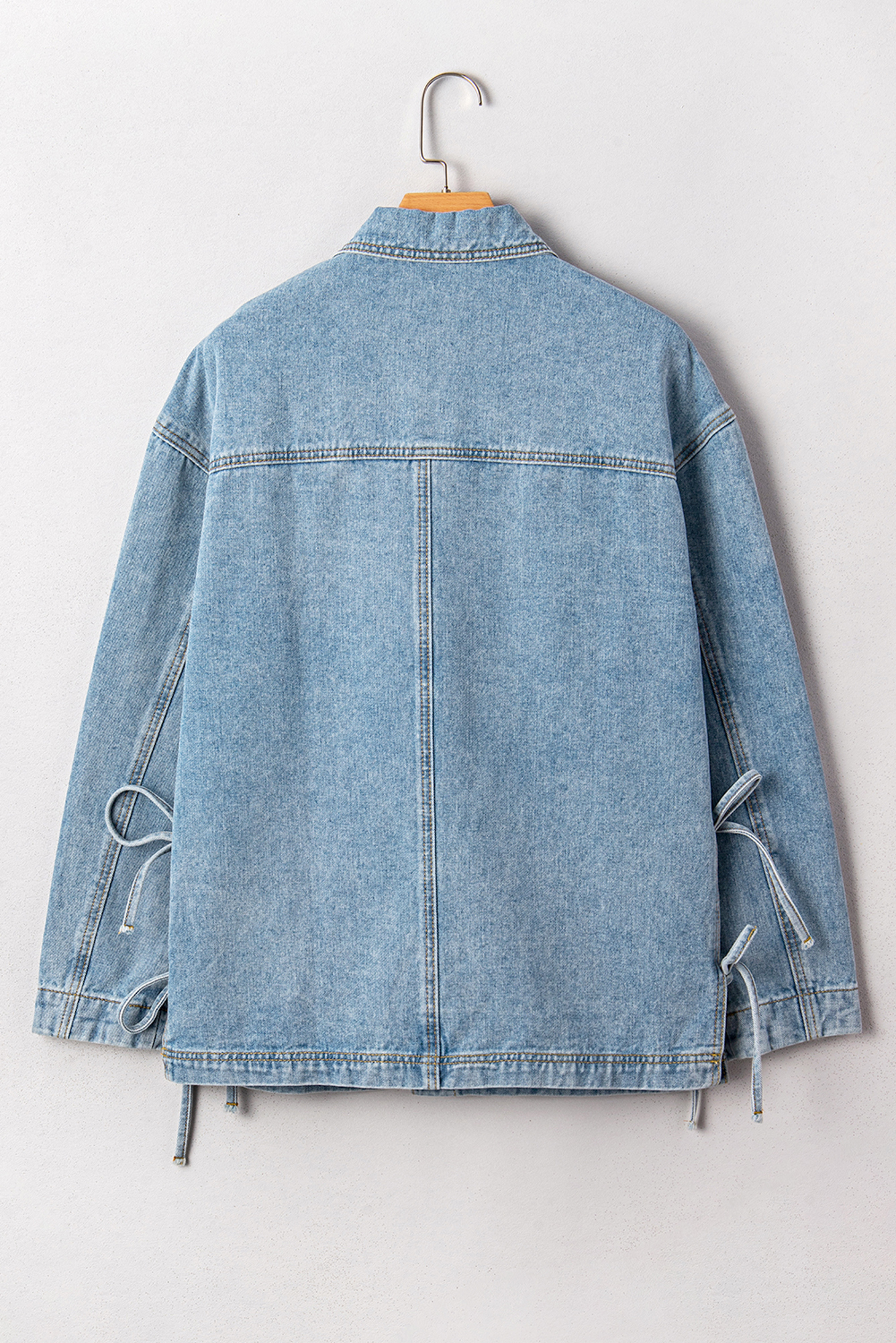 Meet Harper Up Boyfriend Style Jacket—effortless, flattering, and easy to style for everyday life. Elevate casual style with this oversized boyfriend denim jacket. Features front pockets and a unique side tie up detail. This light wash jacket pairs perfectly with any outfit. The boyfriend style adds a modern touch to this classic jean jacket. Denim jacket for trendy fashion-forward styles. Material: 75%Cotton+25%Polyester.