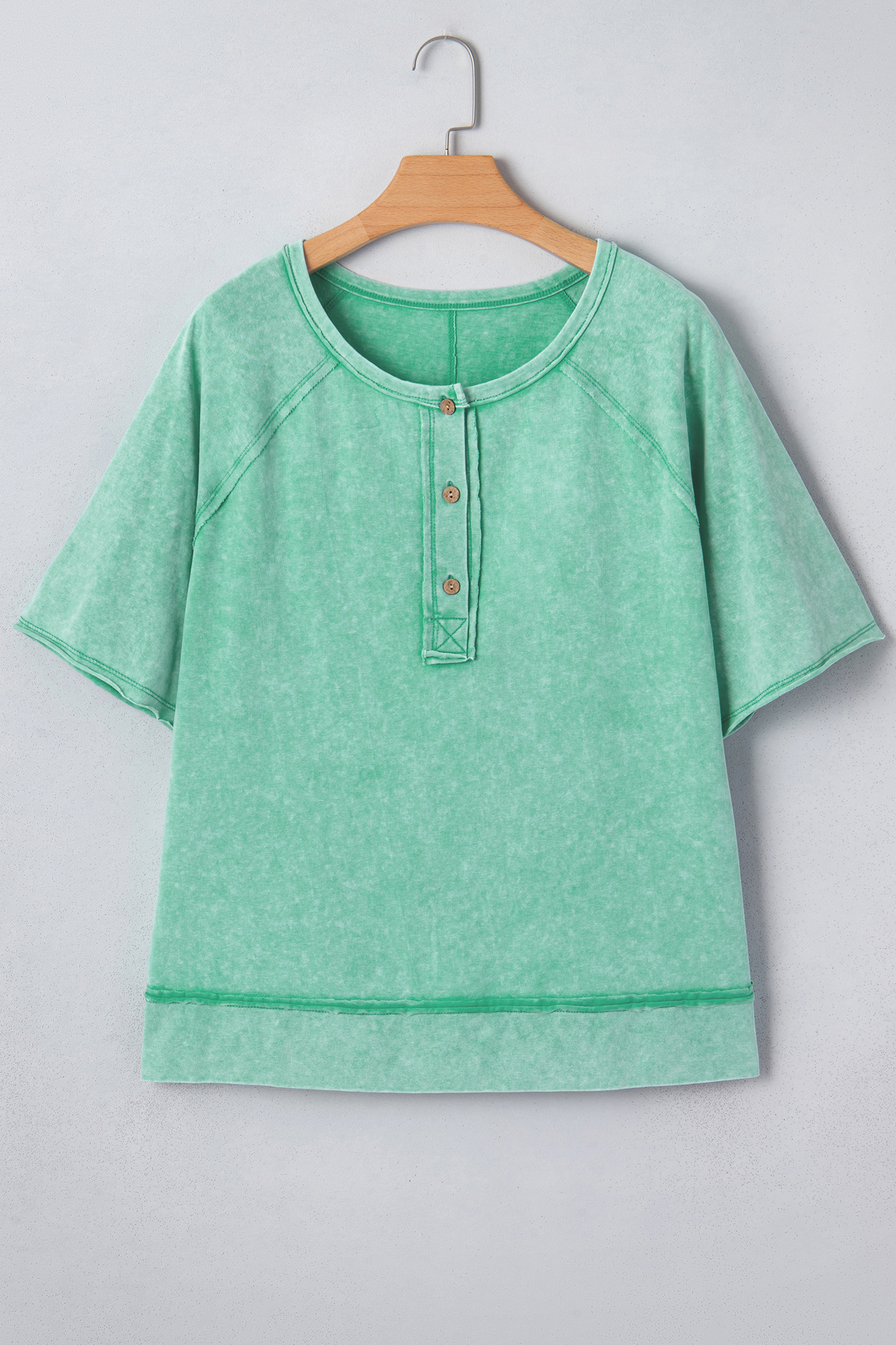 Make Holland Mineral Wash T Shirt your grab-and-go choice for effortless, everyday dressing. Mineral wash finish adds vintage appeal to this womens T T-shirt. Half button front creates a casual, adjustable neckline. Raw seam detail delivers a trendy, lived-in streetwear look. Raglan sleeves gives this mineral wash tee a classic design. Material: 100%Cotton.