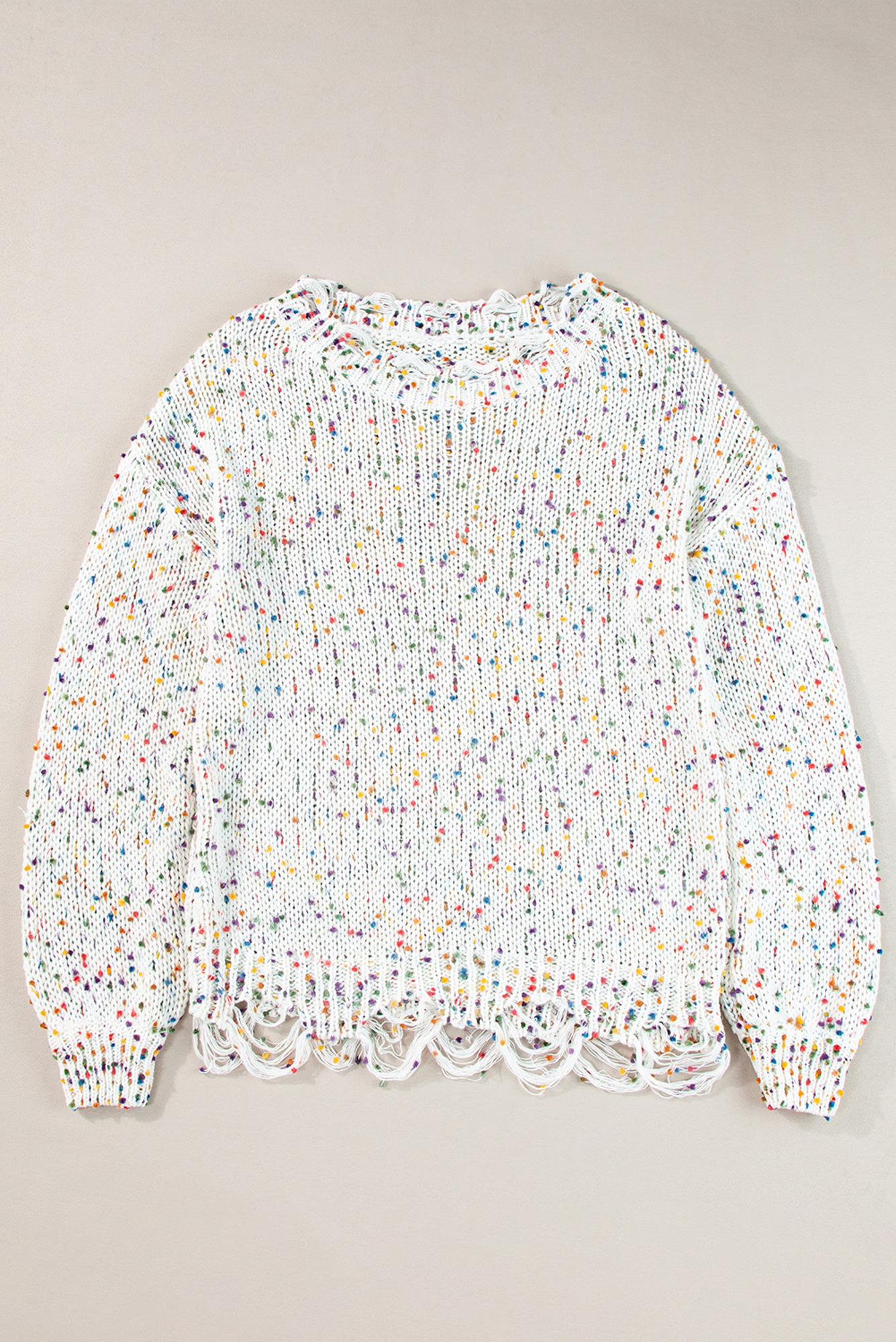 Stay comfy and put-together all at once in Isabel Confetti Distressed Knit Sweater. Slay all season long in our Colorful Confetti Distressed Knit Sweater. It features colorful confetti knit silhouette with ribbed texturing. The rounded neckline that can be worn off one shoulder. Relaxed silhouette falls into an uneven hemline with distressed detailing. Material: 100%Polyester.