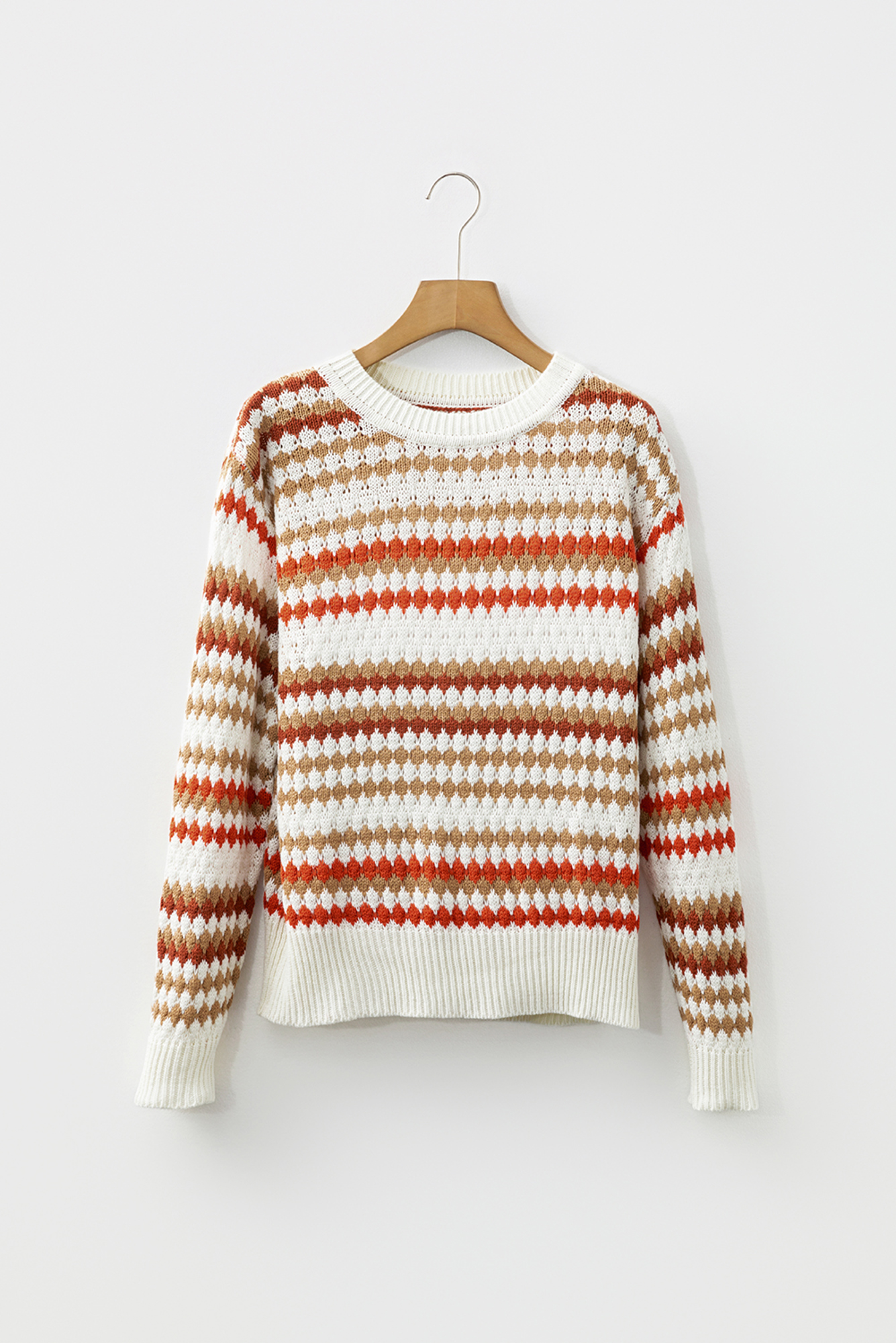Meet Jimena Patterned Drop Shoulder Sweater—effortless, flattering, and easy to style for everyday life. Trendy drop shoulder design for a relaxed fit. Eyelet pattern adds a touch of elegance. Chic striped pattern for a fashionable look. Comfortable and cozy fabric for all-day wear. sweaters are versatile and easy to style. Material: 60%Cotton+40%Acrylic.