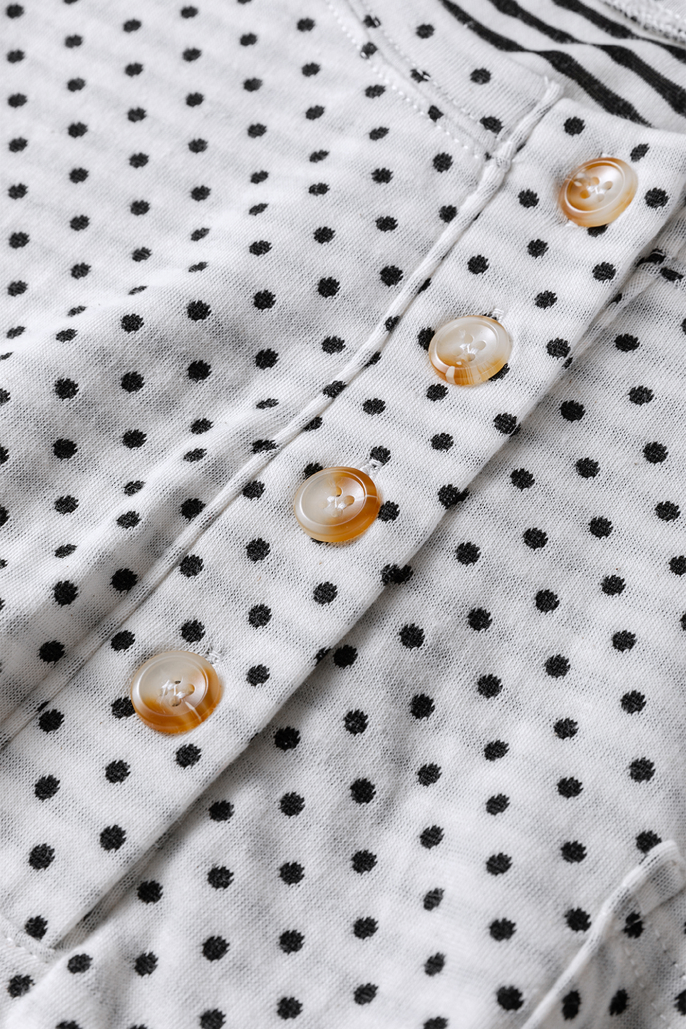 Jordyn Sleeve Henley top Long Sleeve PLUS Top is made for real life—easy to wear, easy to love. Stylish dot and stripe patchwork Henley top adds playful visual contrast. Designed for plus size comfort, offering a relaxed and flattering fit. Button neckline adds a casual touch to this chic everyday piece. Soft, stretchy fabric ensures ease of movement and cozy wear. Material: 59%Polyester+41%Cotton.