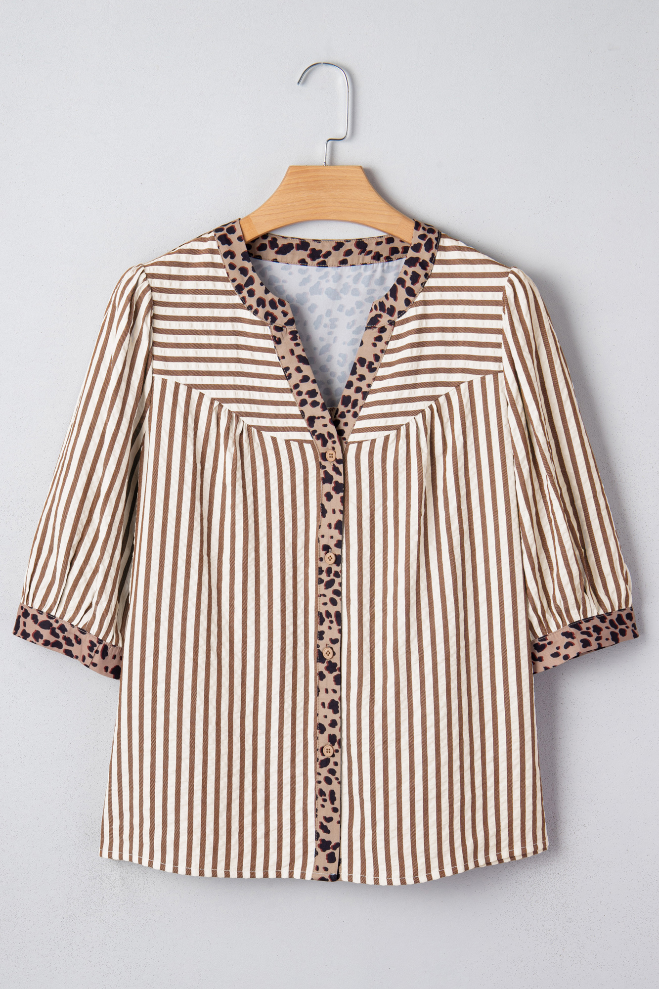 From coffee runs to casual nights out, Jream Down Half Sleeve Shirt is ready for it all. Trendy striped V neck shirt with chic leopard trim detail for bold contrast. Button down front and half sleeves create an easy, flattering silhouette. Breathable lightweight fabric keeps you cool and comfy all day long. Perfect casual shirt to style with jeans, skirts, or tailored pants. Material: 50%Polyester+50%Viscose.