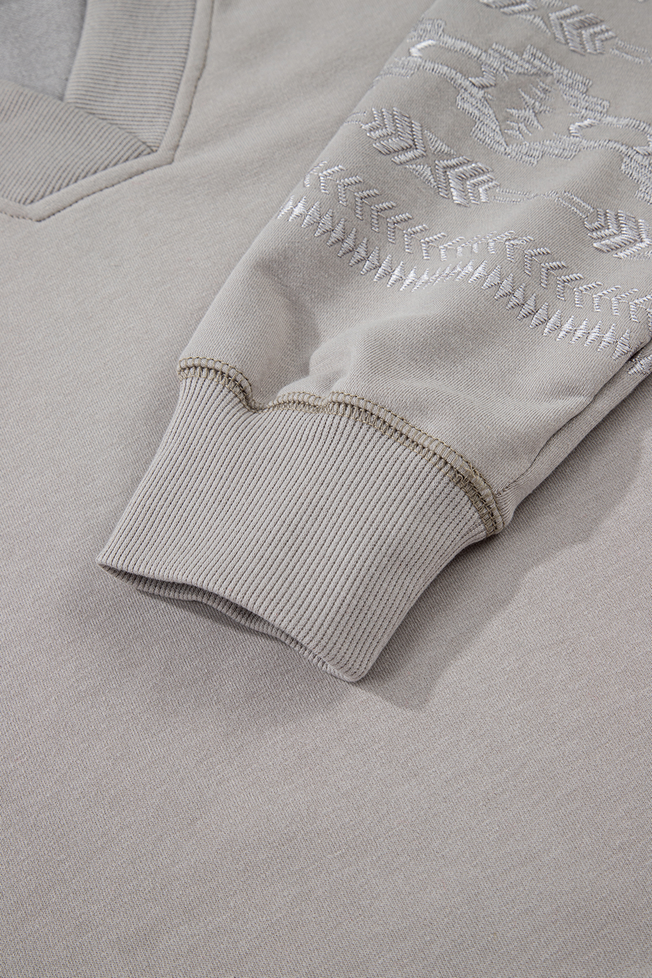 Introducing Kaylee aztec Embroidered Western Sweatshirt—the perfect blend of casual comfort and put-together style. Aztec embroidered gives this pullover an unique western flair. Ribbed edge makes it more fitted and structured. The exposed seam adds extra chic detail. This womens sweatshirt with v neck is great to show a slim feminine look. Material: 80%Polyester+20%Cotton.