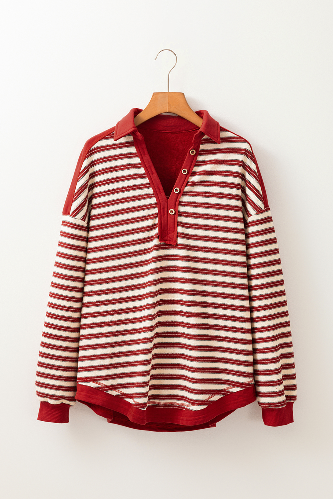 Meet Kylalara Collared Drop Shoulder Top—effortless, flattering, and easy to style for everyday life. The top features a classic striped pattern which is popular among people. It includes a v neck with buttoned detail and collared design. The drop shoulder gives the top a relaxed and trendy fit. This striped top is a versatile piece that can be paired with various bottoms. womens tops from Dear-Lover in bulk with attractive prices. Material: 95%Polyester+5%Elastane.