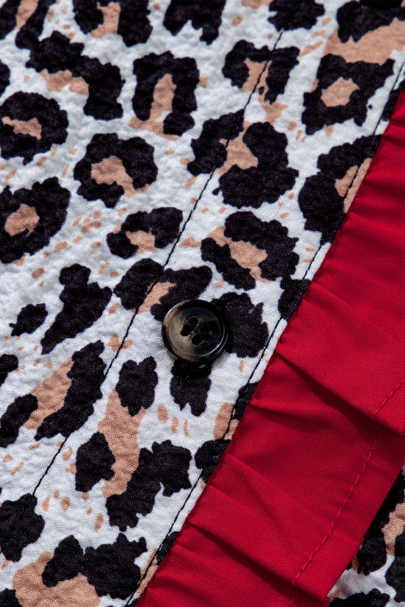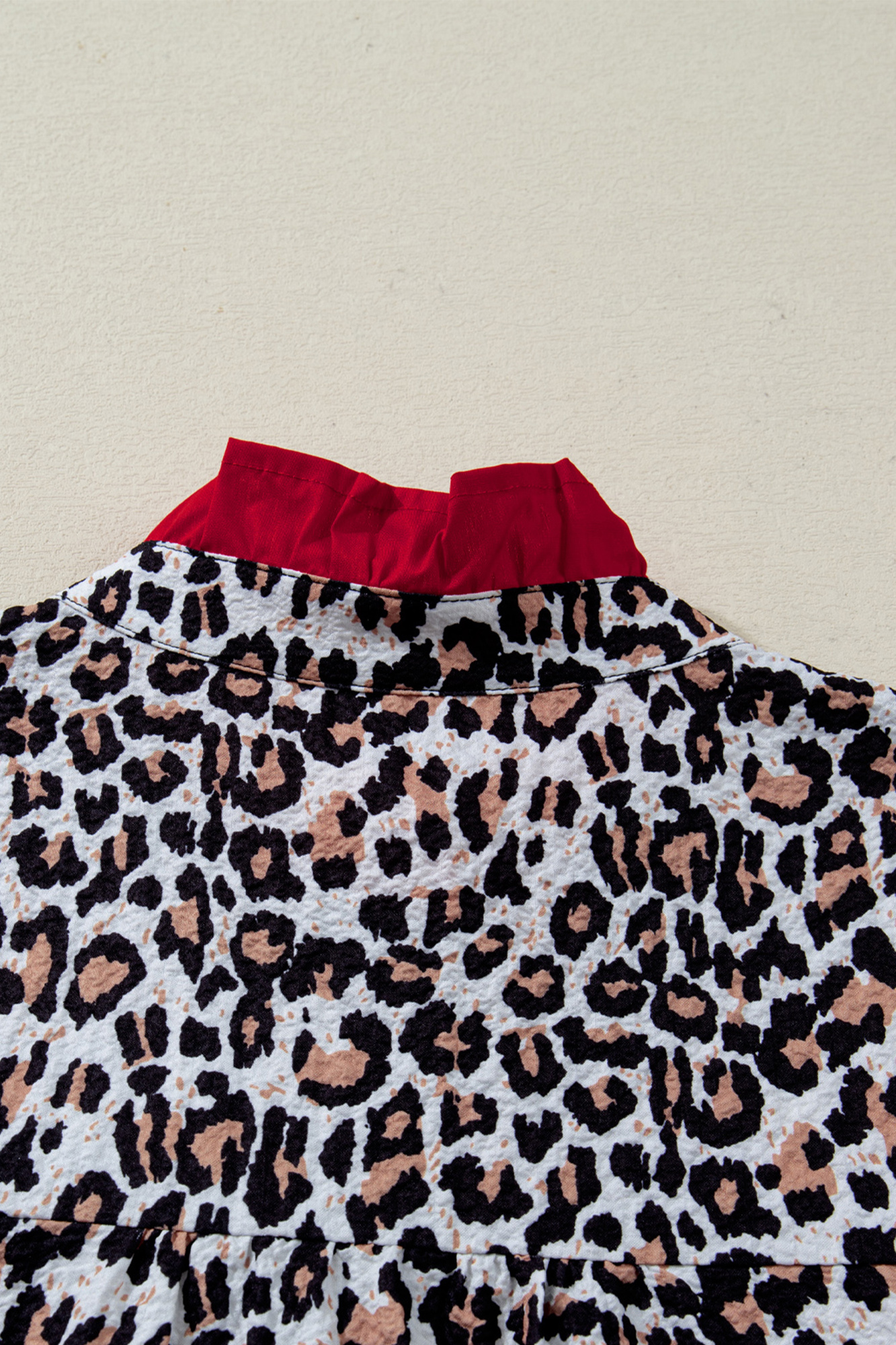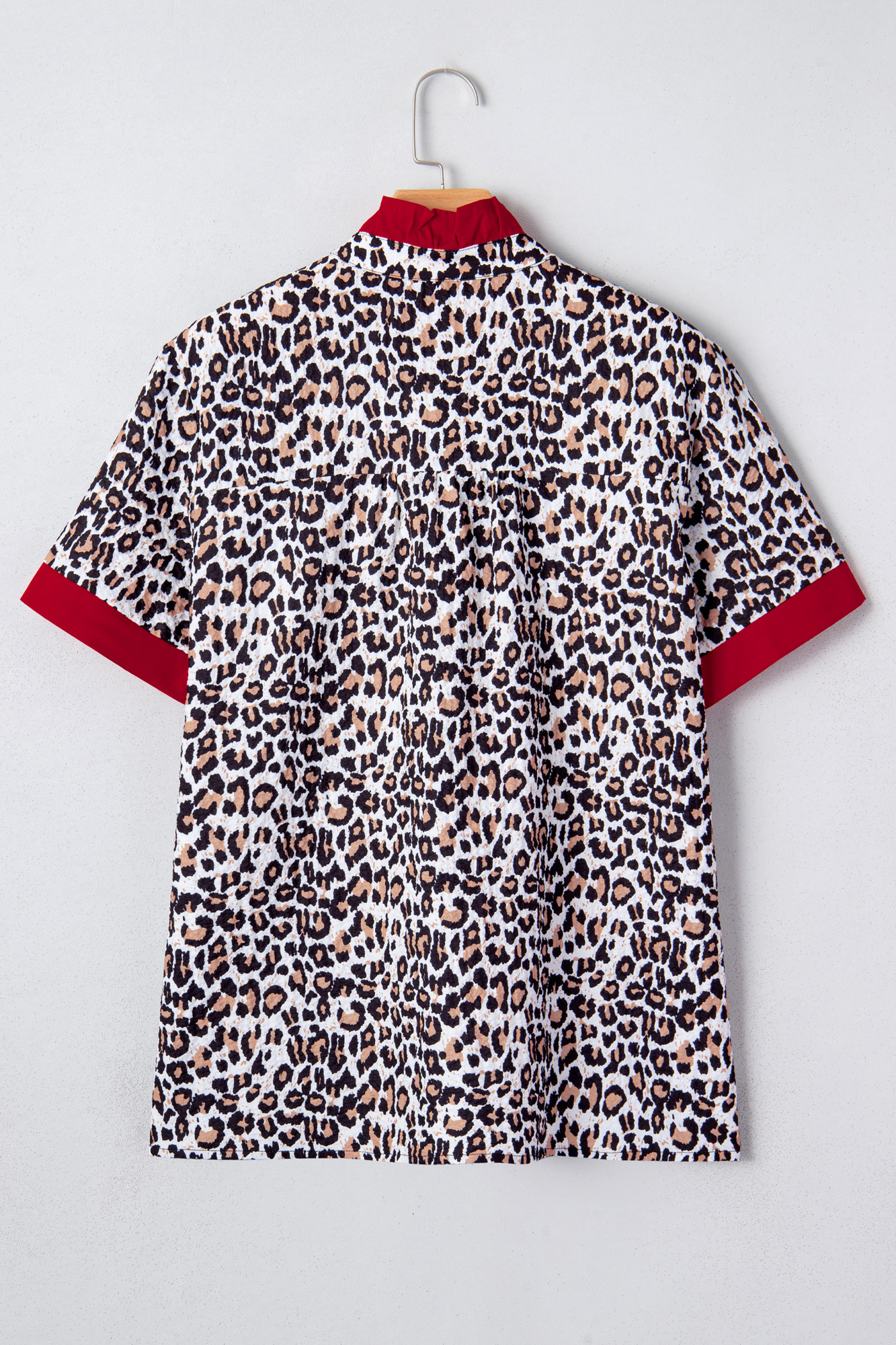 Keep it simple in Laura Contrast Frilled Trimmed Shirt—an easy favorite you’ll keep in regular rotation. The contrast frilled v neck adds a spotlight to this wild t shirt. This casual tee is loved with fierce leopard pattern allover. It’s flattering fit for most body shapes. The colorblock trim design makes it more eye-catching in the crowd. Material: 100%Polyester.
