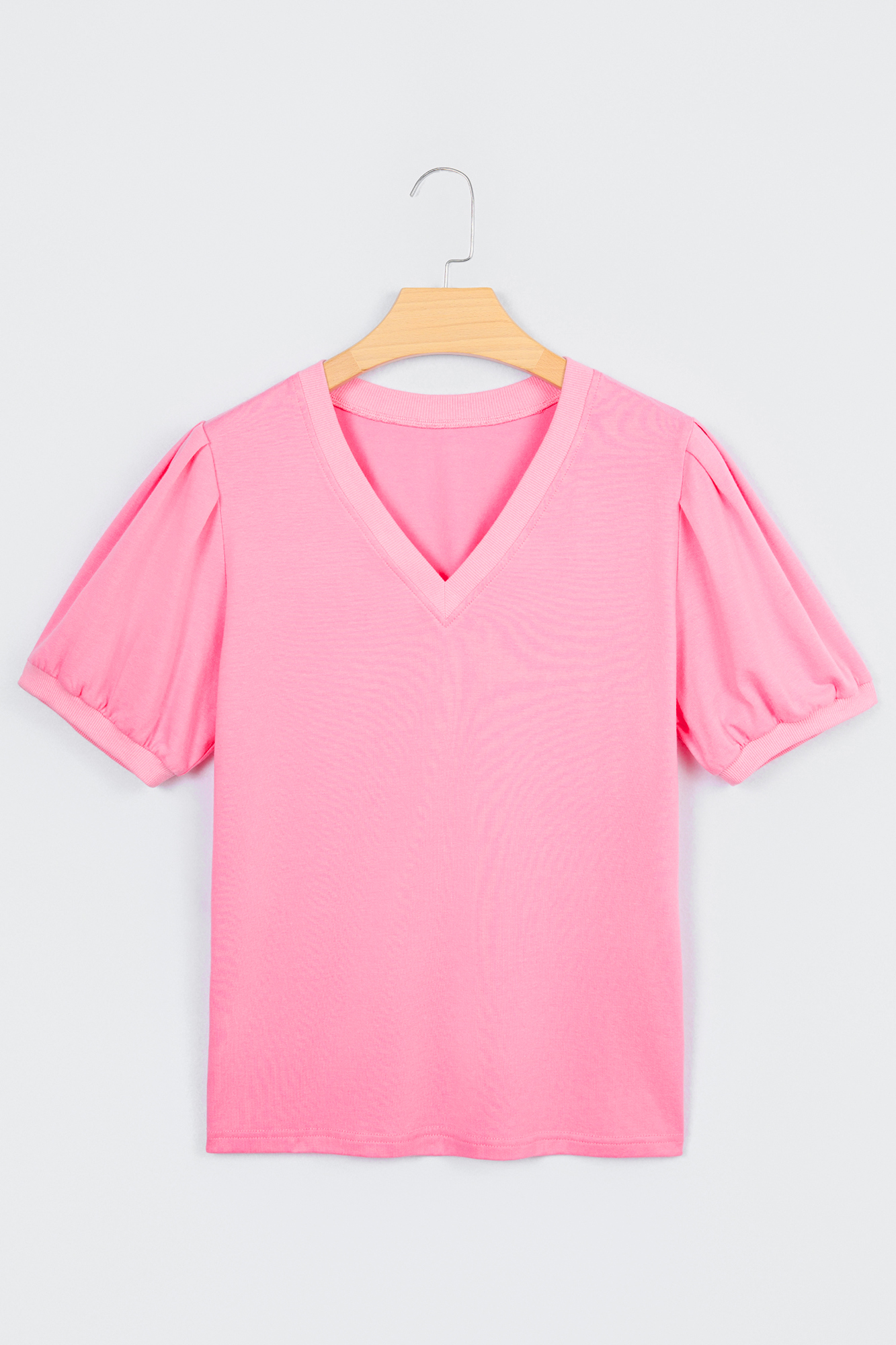 From coffee runs to casual nights out, Lilah Short Puff Sleeve Blouse is ready for it all. Clean solid color design keeps the look timeless and easy to style. V-neckline enhances the silhouette with a flattering, feminine touch. Short puff sleeves add soft volume for a polished, modern feel. Lightweight fabric ensures cool, breathable all-day comfort. Material: 62%Polyester+32%Cotton+6%Elastane.